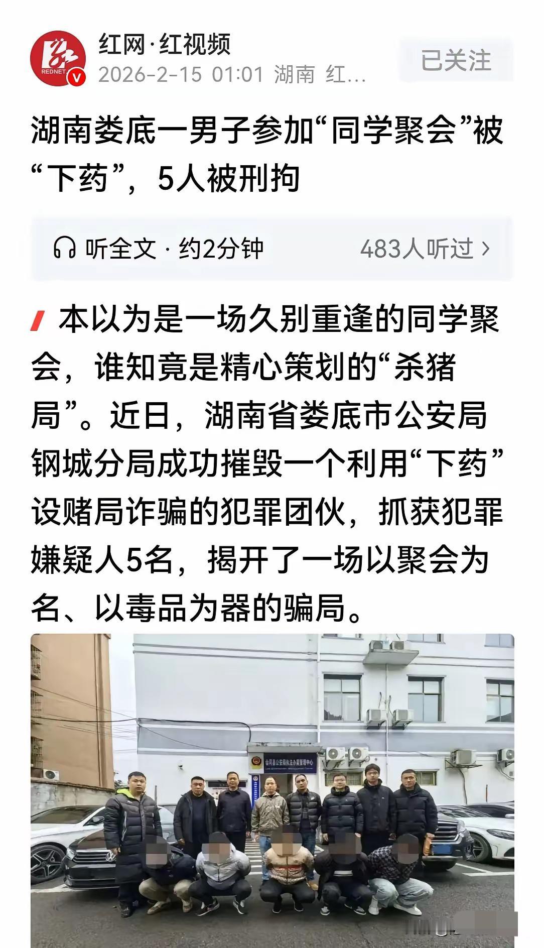 幸亏多留个心眼!湖南娄底一场看似温情的同学聚,竟藏着要命的“杀猪局”,看完真的脊背发凉。 久未联系的老同学突然邀约,赴约却满桌陌生人,轮番劝酒后身体出现异常昏沉,不是醉酒更像被控制。男子果断脱身报警,血检查出违禁成分,这根本不是叙旧,是预谋下药设赌局的犯罪圈套。 人心隔肚皮,最该提防的就是这种披着熟人外衣的恶意。出门聚餐,杯子不离眼、酒水不碰来路不明的,再熟的人劝酒也别硬扛,警惕心真的能救命。 春节聚会越来越多,你遇到过反常劝酒的情况吗?平时都会怎么防范?