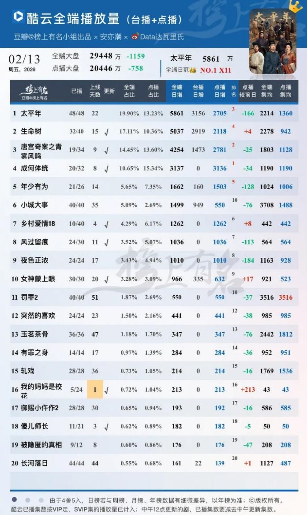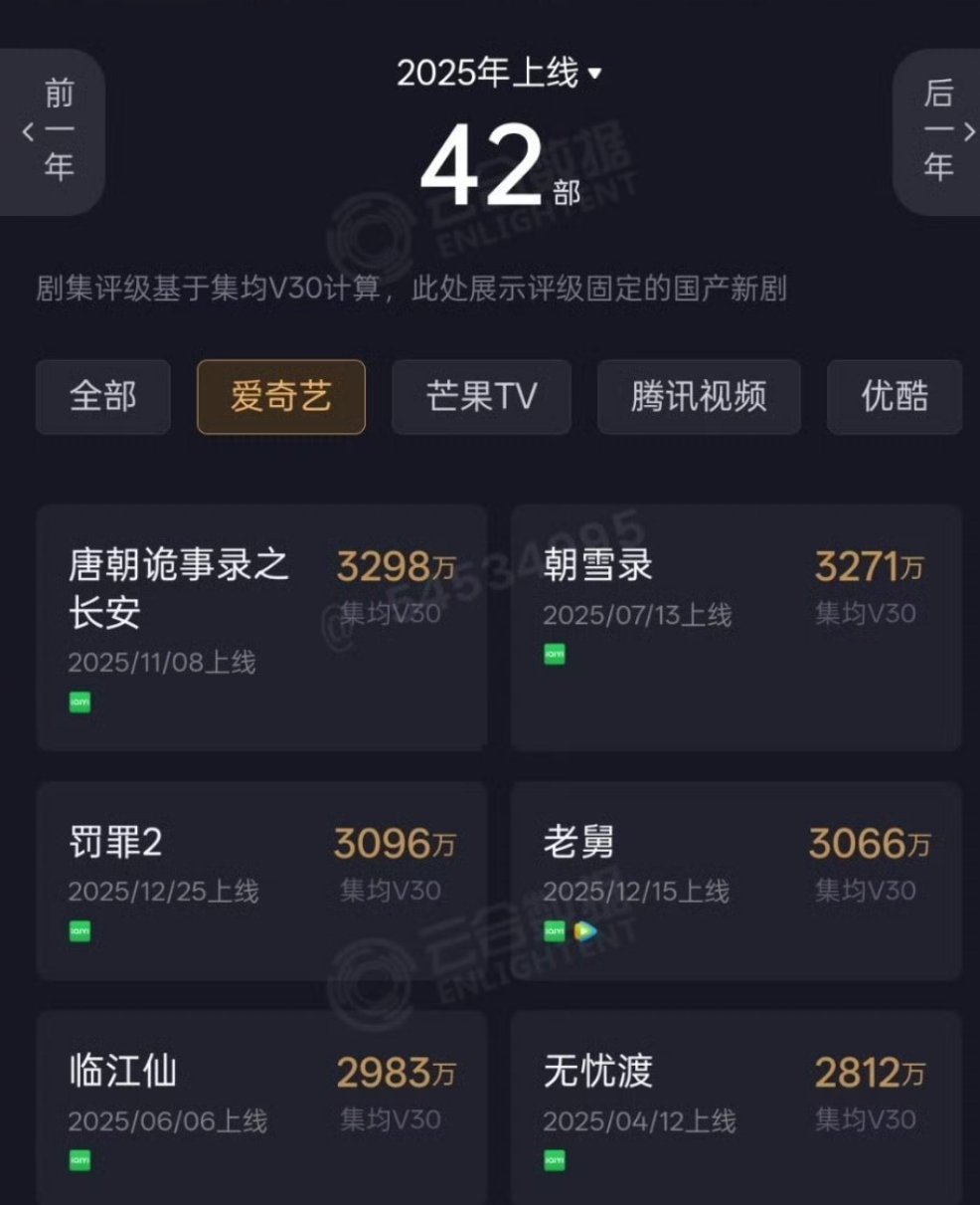 20260214恭喜罚罪2热播期结束 云合集均3405w 在今年所有开播剧里暂列第一🎉 v30集均3096w在今年所有开播剧里暂列第一🎉酷云截止到目前也已经突破3500w在今年所有开播剧里暂列第一🎉同时罚罪2也是今年爱奇艺第一部破万剧(也是目前为止唯一一部) 🎉
