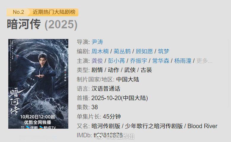 龚俊《暗河传》的长尾效应好牛,2026年台词依然在出圈,优酷古装剧大屏点播TOP1,豆瓣1月份热门大陆剧第2,德塔文2月份还在榜,爱上苏暮雨简直人之常情!