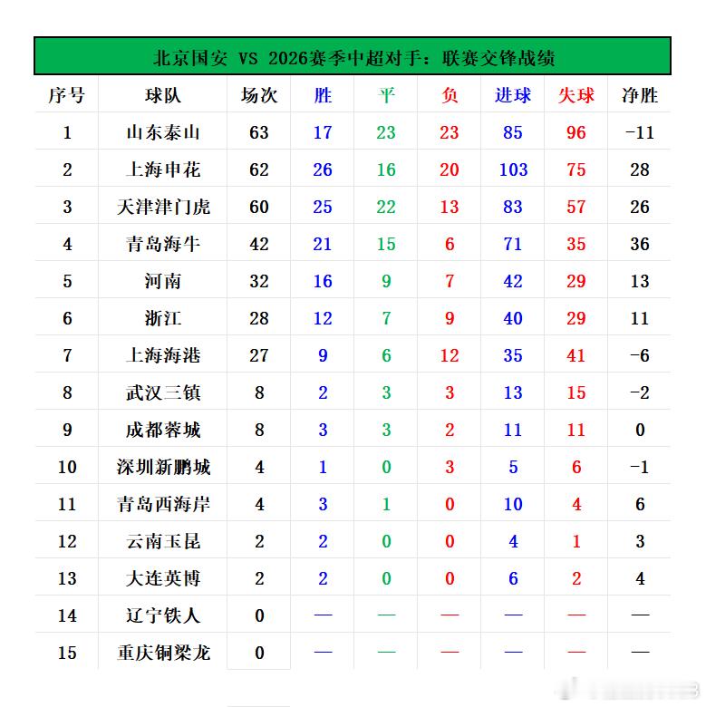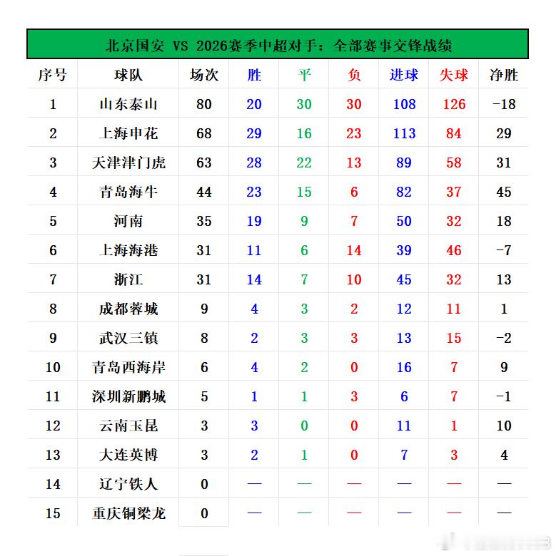北京国安 VS 2026联赛对手历史战绩一览📊