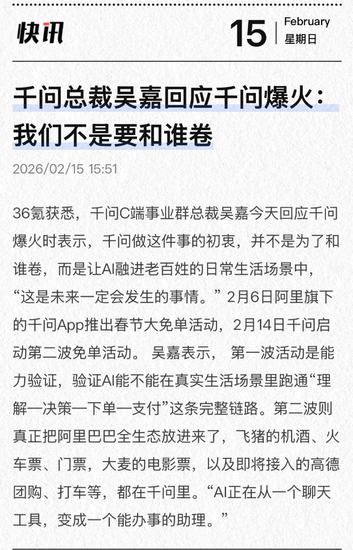 千问爆火之后,总裁吴嘉的回应有点意思! 2月6日阿里旗下的千问春节第一波活动——请大家喝奶茶,9小时的订单就超过1000万单;2月14日千问启动第二波免单活动,大家纷纷在上边订起了酒店,门票等等。 当外界都在猜测千问如此大手笔投入春节档的目的时,千问总裁吴嘉接受了采访。 看了下他的采访内容,核心意思很明确,大概总结起来有两点。 第一:不是要和谁卷,是要让AI融进老百姓的日常生活场景中,因为这是未来一定会发生的事儿! 第二:坚信中国的AI应用领域会走在世界前列。 仔细想想,吴嘉这个回答还是很中肯,很接地气的。 因为能明显感受到,千问春节前的这两波活动,基本上也是围绕这两点来走的。不管是请大家喝奶茶,体验AI订餐的便利,还是让发放超级免单卡,都是通过千问真金白银的补贴,来邀请广大用户体验新的AI消费方式。 纵观国内外这么多的AI应用,千问是第一个实现AI帮普通人办事,AI购物的。 这也不由得让人想起当年的移动支付,遥想当初,咱们也是第一个吃螃蟹的人,很多人一开始并不看好,而现在的移动支付已经成了人人出门都会用到的存在。 如今千问一身入局,带动AI链接现实生活,很有可能复刻当年移动支付的故事,让中国AI领先世界。