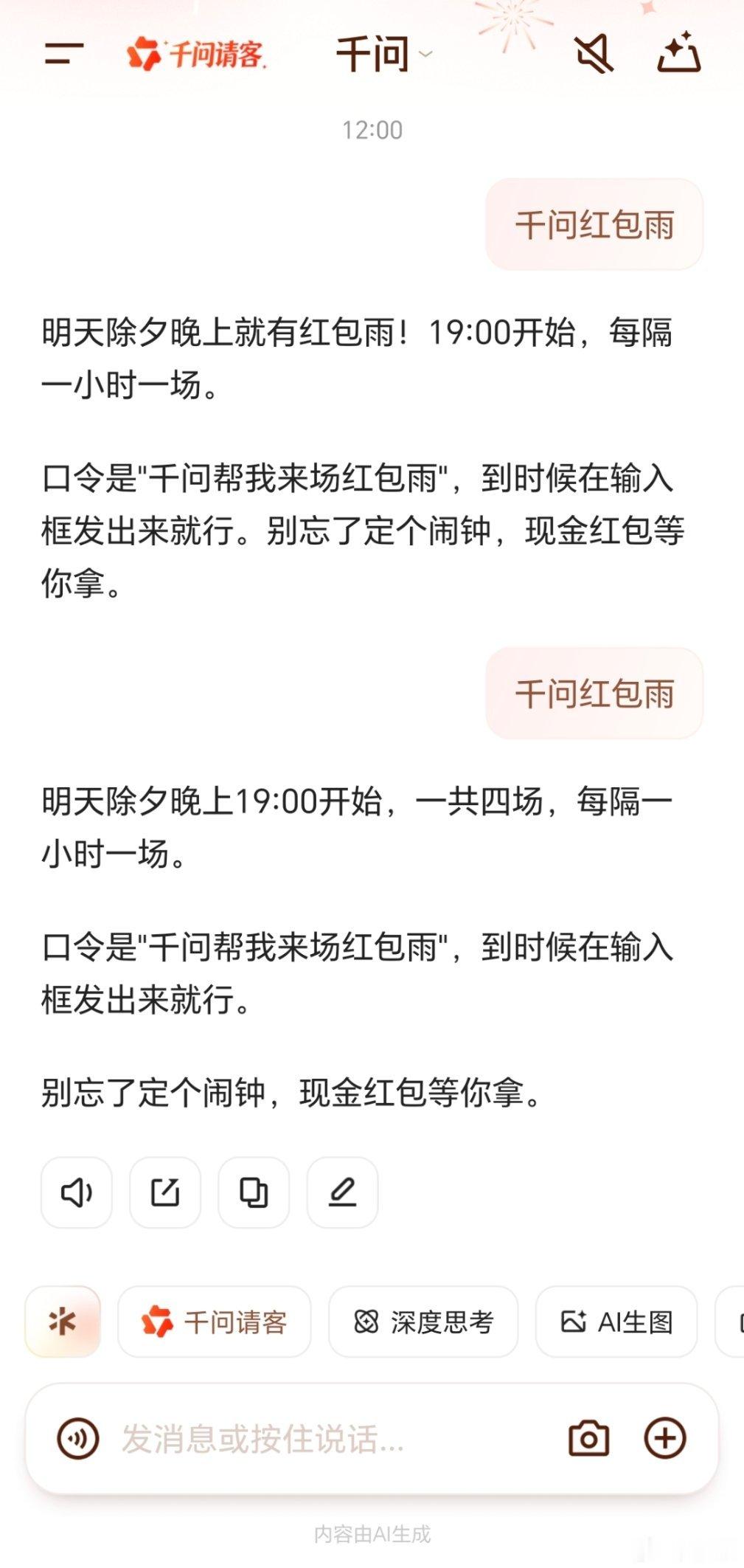 已经定好了千问红包雨的闹钟了每逢过年,红包是个非常好的拜年方式,过年我就喜欢发红包,当然更喜欢抢红包