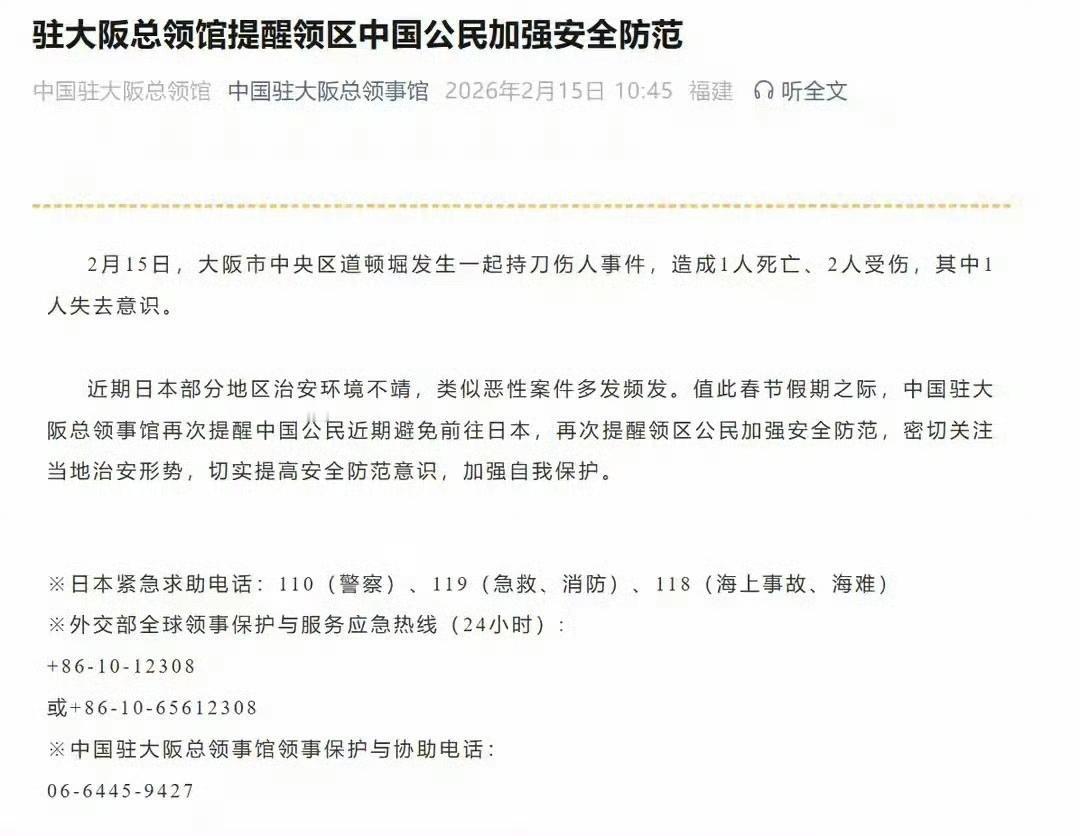 大过年的,日本那边又出事了。 2月15日,大阪市中央区道顿堀发生持刀伤人事件,造成 1人死亡、2人受伤,中领馆已及时发文提醒避免前往。 其实这已经不是国家第一次提醒了。 去年11月,使领馆就说过:日本社会治安不靖,针对中国公民的歧视和暴力事件明显增加,请避免前往。 当时日本那边还不乐意,内阁官房长官跳出来"抗议",说中方反应过度。结果呢?三个月不到,大阪街头直接出人命了。 有人说,这是个别事件吧?哪儿还没个精神病? 这话听起来有道理。不过,治安变差是一回事,针对中国人的恶意变多是另一回事据统计,从去年起,驻日使领馆接到的求助明显上升,多名中国公民报告被无端辱骂甚至殴打。 更要命的是,日本首相高市早苗最近在台湾问题上蹦得挺高,说什么"台湾有事就是日本有事"。你听听,这叫人话吗?那边煽动对抗,政治毒素往下渗透,最后买单的肯定是在日华人和中国游客。 评论区还有些人阴阳怪气:"领馆管得真宽,我去哪儿还要你批准?" 其实,谁都没拦你,腿长在你身上,别人也拦不住。只是告诉你:那边有问题,你先别去。听不听是你的事,但出了事别打电话哭。 有人说,春节机票酒店都订好了,不去亏死。我想问问:是一张机票钱重要,还是安全重要?大阪那三个被捅的,出门前肯定也没想过今晚会躺进ICU。 所以,出门在外,安全第一,面子第二。 想去日本看雪、看海、看富士山的,再仔细考虑考虑,国内景点多的是,何必跑那么远? 已经在日本的,记好三个电话:110(警察)、119(急救)、118(海上事故)。存手机里,比发朋友圈管用。 最后说句不好听的:人这一辈子,能去的地方很多,但生命只有一次。别跟安全较劲,你较不过。