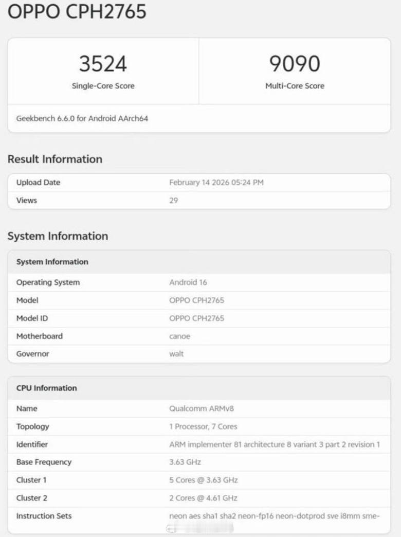 OPPO Find N6国际版跑分。非满血对上了,2颗4.61 GHz超大核、5颗3.63 GHz大核。