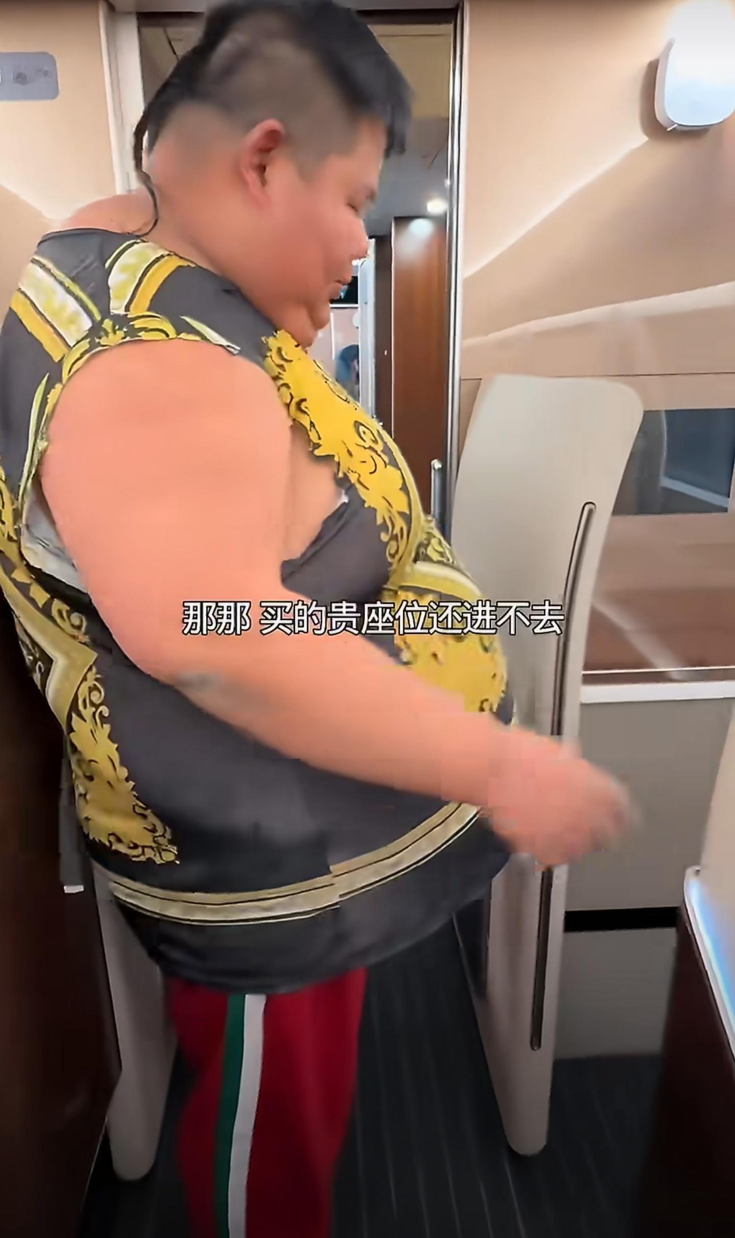 然后努力往里面挤,结果整个人卡在座位和扶手之间,连胳膊都抬不起来。最后没办法,换了一个座,他勉强把自己塞进去,但是看画面也是把座位塞得满满当当的。
