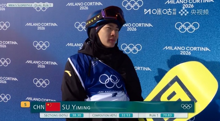 直播吧02月15日讯冬奥会单板滑雪男子坡面障碍技巧资格赛第一轮,第10位出场的苏翊鸣得到70.83分,在已经完赛的10名选手中暂列第五。