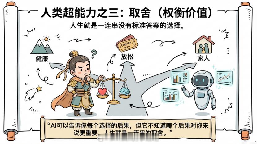 AI最擅长优化,但优化的前提是目标明确。问题是,人生哪有那么多明确的目标?就像你周末想出去玩,是去爬山锻炼身体,还是去看电影放松心情?是陪家人,还是见朋友?每个选择都有道理,但你只有一个周末。这些问题没有标准答案。每个选择都有代价,关键是你愿意付出什么代价。AI可以告诉你每个选择的后果,但它不知道哪个后果对你来说更重要。人生就是一连串的取舍。会取舍的人,才能用AI走出自己的路。第三,建立关系
