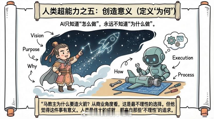 人能感受到意义,AI不能。什么叫意义?就是"为什么做这件事"。AI只知道"怎么做",不知道"为什么做"。你给它一个目标,它能优化执行路径。但这个目标本身有没有意义,它不知道。就像养孩子。AI能告诉你怎么让孩子考高分、进名校。但你为什么要养孩子?这个问题AI回答不了。马教主为什么要造火箭?从商业角度看,这是最不理性的选择。但他觉得这件事有意义,所以他愿意为之付出一切。人类最伟大的成就,都来自那些"不理性"的追求。而这种追求,AI永远不会有。有了这五个能力,你还得学会和AI配合为什么?因为未来不是人单干,也不是AI单干,而是人和AI配合。有句话怎么说来着,血肉苦弱,机械飞升。