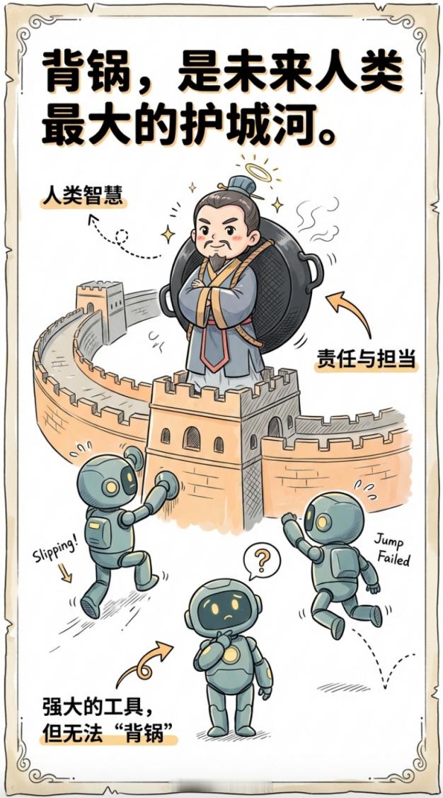 因为AI啥都能干,但就是不能背锅。而且,你必须得学会和AI配合,因为知识越来越不值钱,未来会用AI的人对不会用AI的人,将会是降维打击。 点赞收藏,因为今天我要把AI时代最核心的生存法则给你讲透。看懂的人,未来十年躺着赚钱;看不懂的人,再努力也只能被降维打击。很多人以为AI做不了的是"创造力"、"情感"这些虚的东西。错了。AI真正做不了的,是那些需要"拍板"的事情。而拍板的核心,就是背锅。 你用AI做了个决策,赚钱了,那是你的功劳。亏钱了呢?你能说"这是AI让我做的"吗?不能。因为最终选择相信AI的,是你。就像你开车用导航。导航说左转,你左转了,结果走错了。你能怪导航吗?可以。但交警罚款,罚的是你,不是导航。为什么AI不能背锅?因为责任这个东西,不是算法能承担的。责任背后是后果,是代价,是对未来的承诺。你看那些成功的企业家,本质上都是"职业背锅侠"。公司赚钱了,功劳是大家的;公司亏钱了,责任是老板的。 这就是为什么老板拿最多的钱。因为他背最大的锅。而会背锅的人,才能拿走最大的蛋糕。但背锅不是瞎背,你得有能力做出正确的决策。而做出正确决策,需要其他四个AI做不了的能力。第一,提问AI能回答你的问题,但它不知道该问什么问题。这就像你去医院看病。AI能告诉你感冒吃什么药,但你到底是感冒还是肺炎?这个问题你得先问对了,AI才能帮你。提出一个好问题,本身就需要洞察力。你得首先知道什么才是最重要。