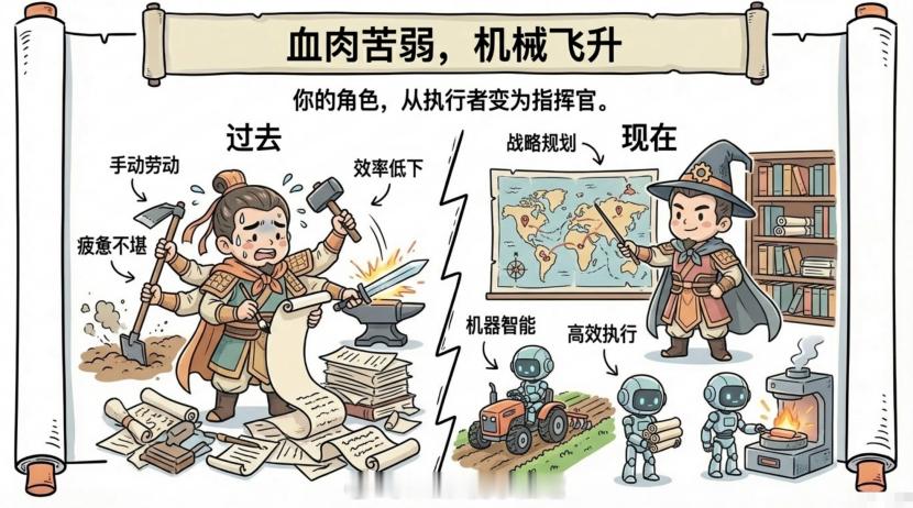 这就是人和AI的关系。不是谁替代谁,而是各干各擅长的事。就像我现在做视频,很多图片、数据整理都是AI做的。但主题、逻辑、观点、想引发的思考,都是我来定的。如果说我以前是筑基修士,那现在至少已经结成金丹,能够催动法宝了。现在我的日产出是以前的三四倍。不要害怕AI。人类第一次掌握长矛的时候,就注定了这个物种将统治全球。不是因为长矛本身多厉害,而是因为人类学会了用工具来放大自己的能力。现在AI就是新时代的长矛。但长矛不会自己杀死猎物,需要一个懂得狩猎、有勇气和智慧的猎人。AI也一样。他只是工具,工具不会代替人类。反而不能适应工具的人类会被适应工具的人类淘汰。从今天开始,修炼自己背锅的能力,修炼和AI融合的能力,你未来的命运,很可能因此改变!风险提示:以上为个人观点,仅供参考。短期涨跌不预示未来,如提及个股或基金不代表投资建议。投资需谨慎。基金基金财经经济人工智能核心竞争力