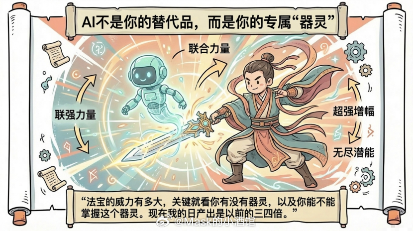 这就像做饭。以前你一个人从买菜、洗菜、切菜到炒菜,全部自己来,一顿饭做三个小时。现在你有了AI这个助手。买菜它帮你在网上下单,洗菜切菜它帮你准备好,但最后怎么炒、放多少盐、火候怎么控制,得你来。AI就像修仙小说里面的器灵。法宝的威力有多大,关键就看你有没有器灵,以及你能不能掌握这个器灵。