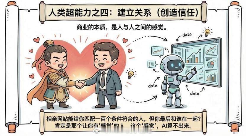 商业的本质是人和人的关系。AI可以帮你分析客户数据,写邮件,做方案。但真正让客户信任你、选择你,靠的是什么?靠的是他感觉到你理解他的痛点,相信你能帮他解决问题,觉得跟你合作很舒服。这就像找对象。相亲网站能给你匹配一百个条件符合的人,但你最后和谁在一起?肯定是那个让你有感觉的人。这个"感觉",AI算不出来。信任、共鸣、化学反应,这些都需要人和人之间的真实互动。AI做不了。你可以用AI提高效率,但你不能用AI替代人际关系。第四,创造意义