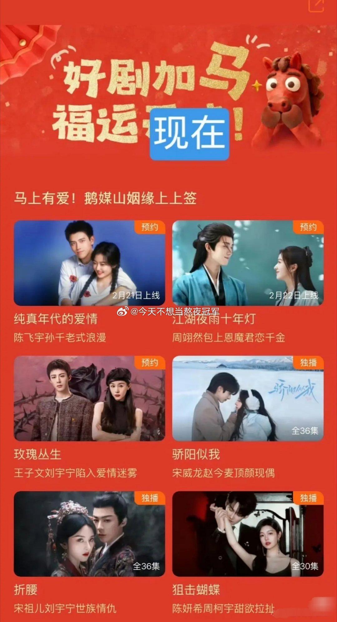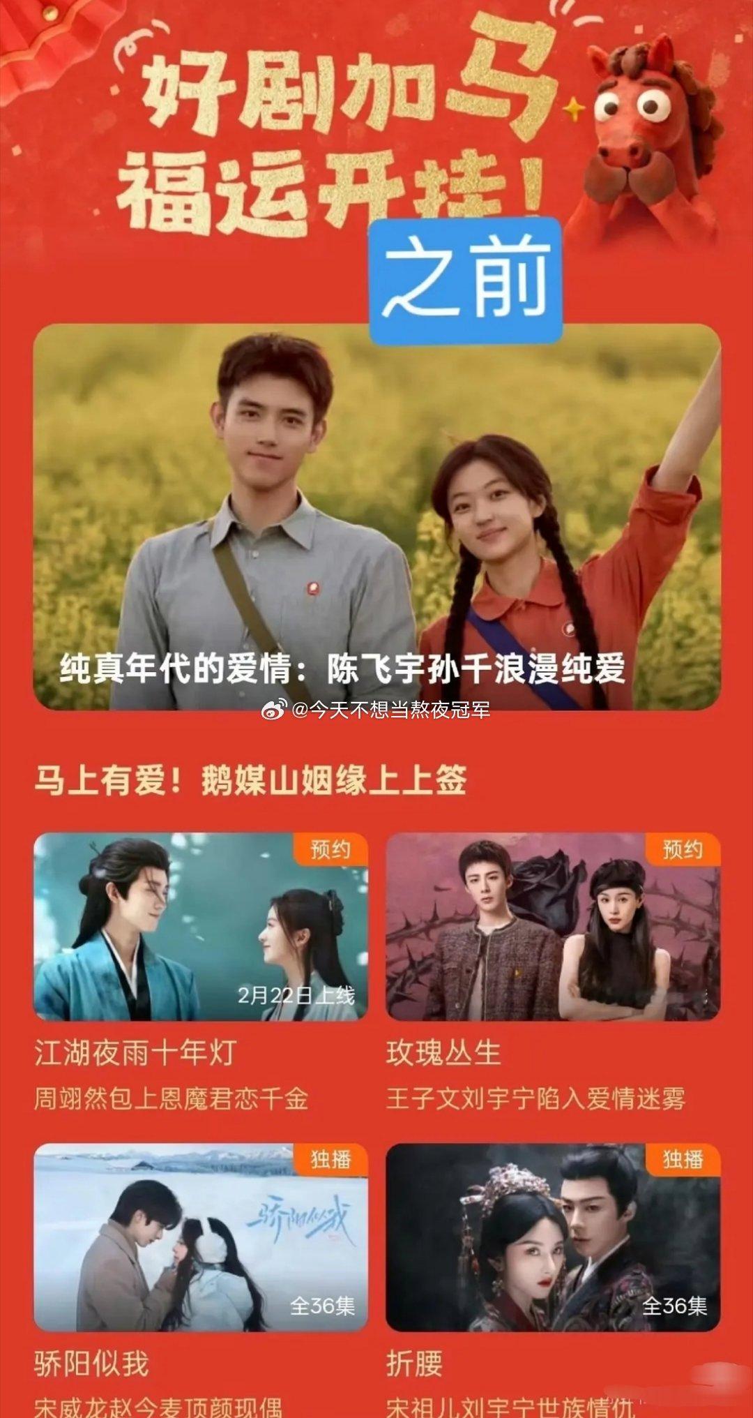 有点尴尬,🐧发了春节大剧片单,陈飞宇 孙千《纯真年代的爱情》原本是最大头版待遇,结果现在站内和站外都被改成了小版面了,固屏也被撤掉了。。。