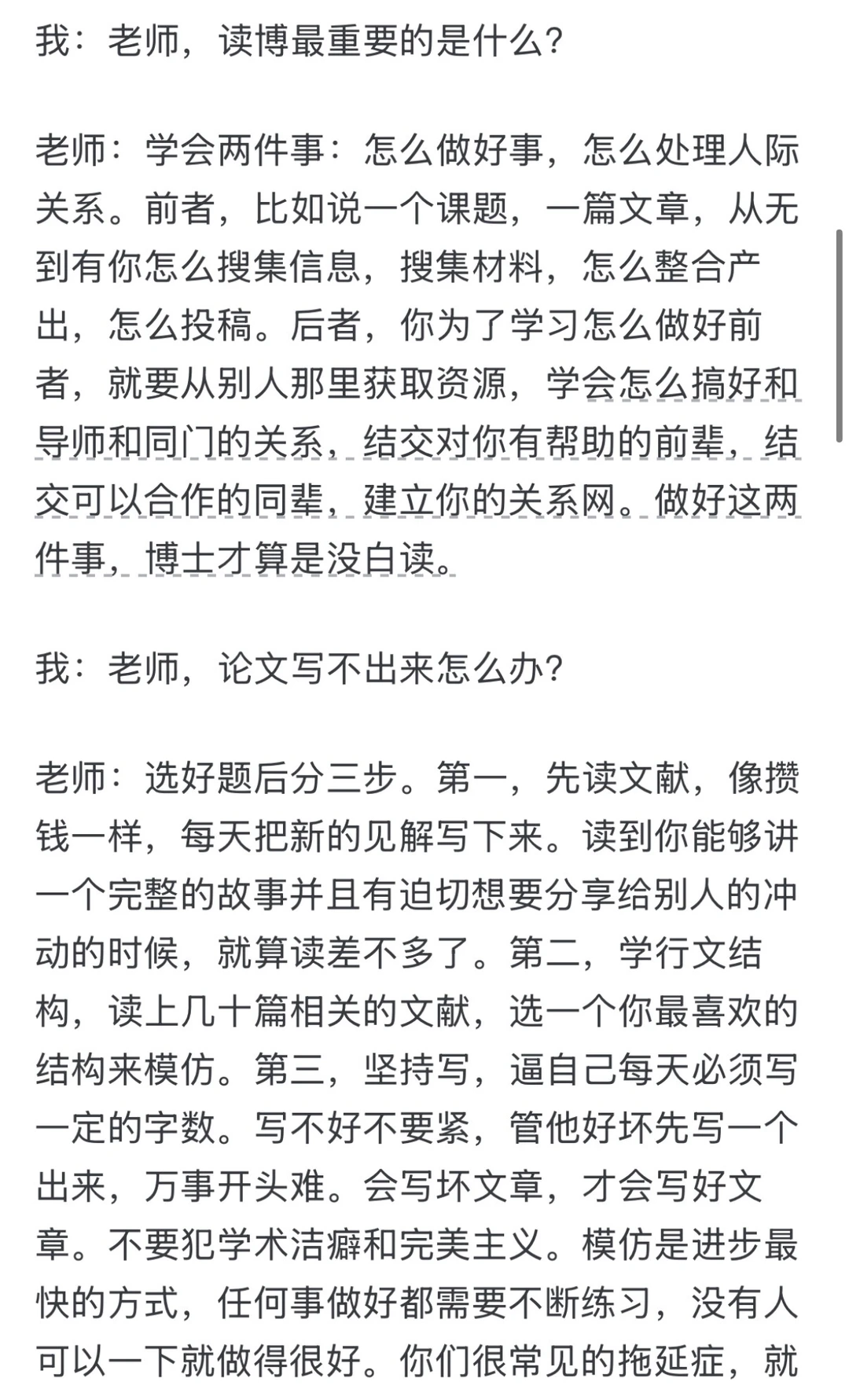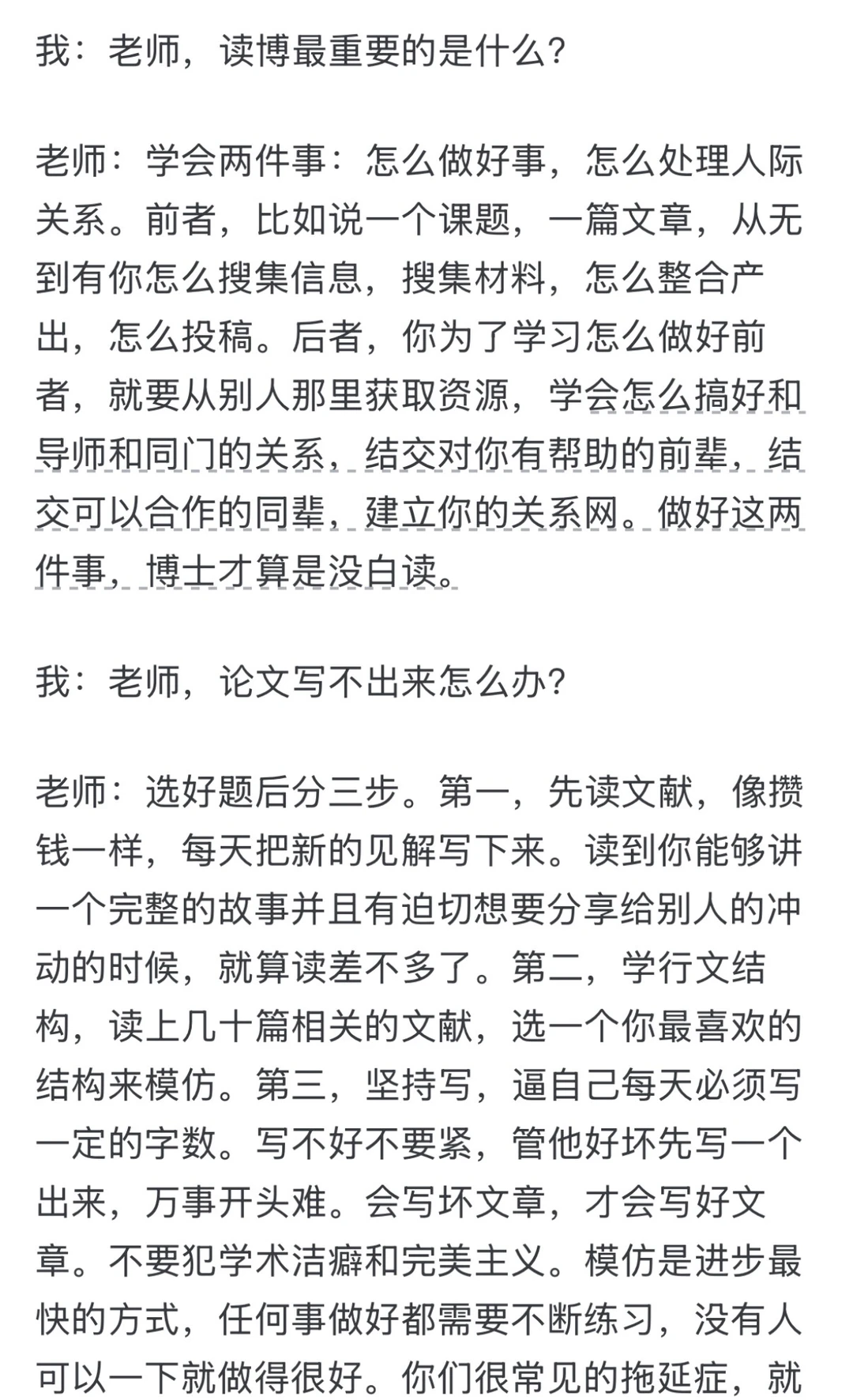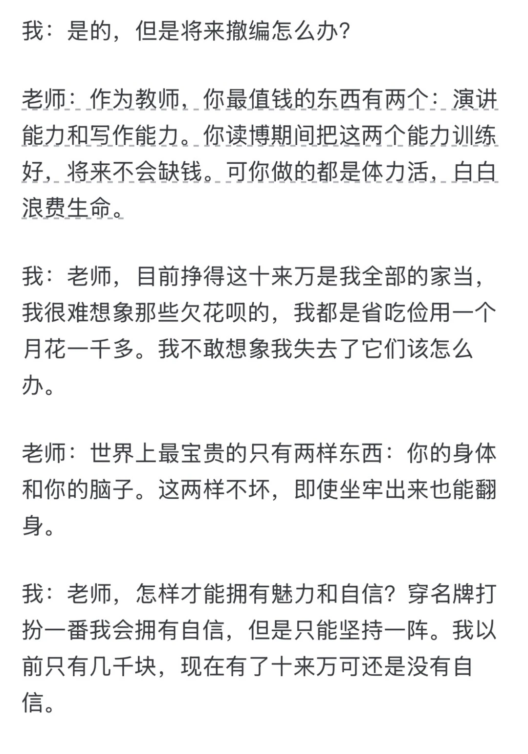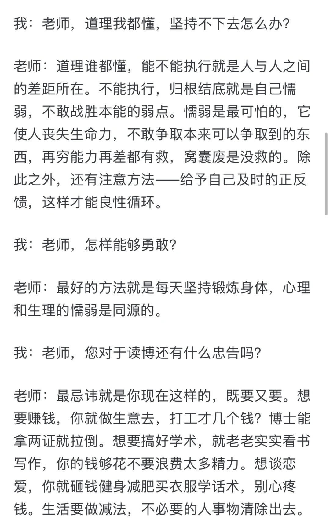 放假前去拜访了小导,受益匪浅。以下是一些对话片段与大家分享。 我:老师,我逐渐意识到了挣钱的必要性。我现在在外面兼职一个月能入八千到一万,但还是觉得少。 老师:你家欠债了吗?急用钱吗? 我:没有,我只是觉得我很需要赚钱。我想博士毕业攒30万。 老师:你做什么赚钱? 我:什么都试着做,跑腿,拍照,阅卷,给小学生讲课什么的。 老师:太低端了。你这是本未倒置。你又不急用钱,你只是被大众媒体搞得焦虑了。现在不应该把赚钱放在首位。你不是想当教师吗?