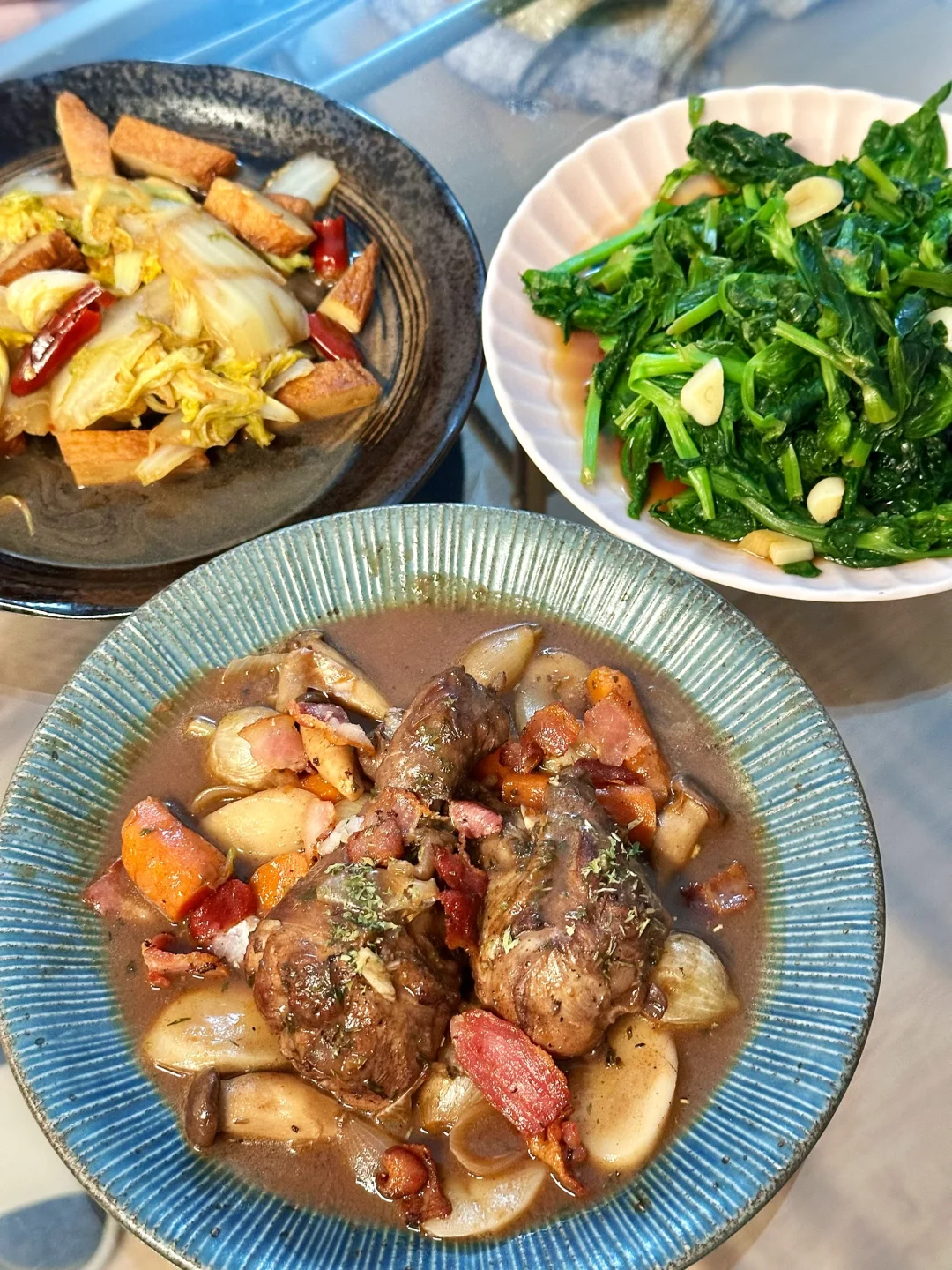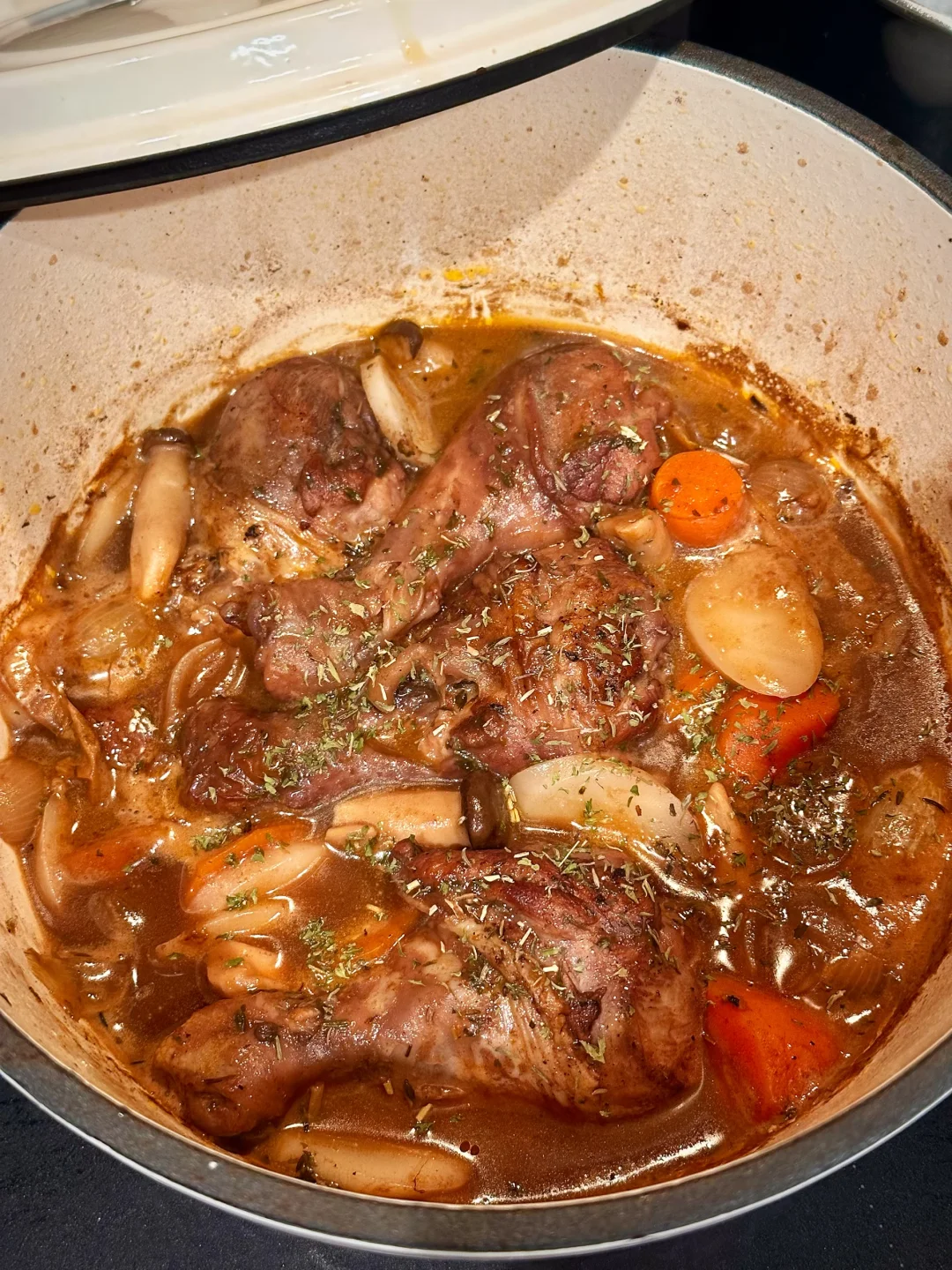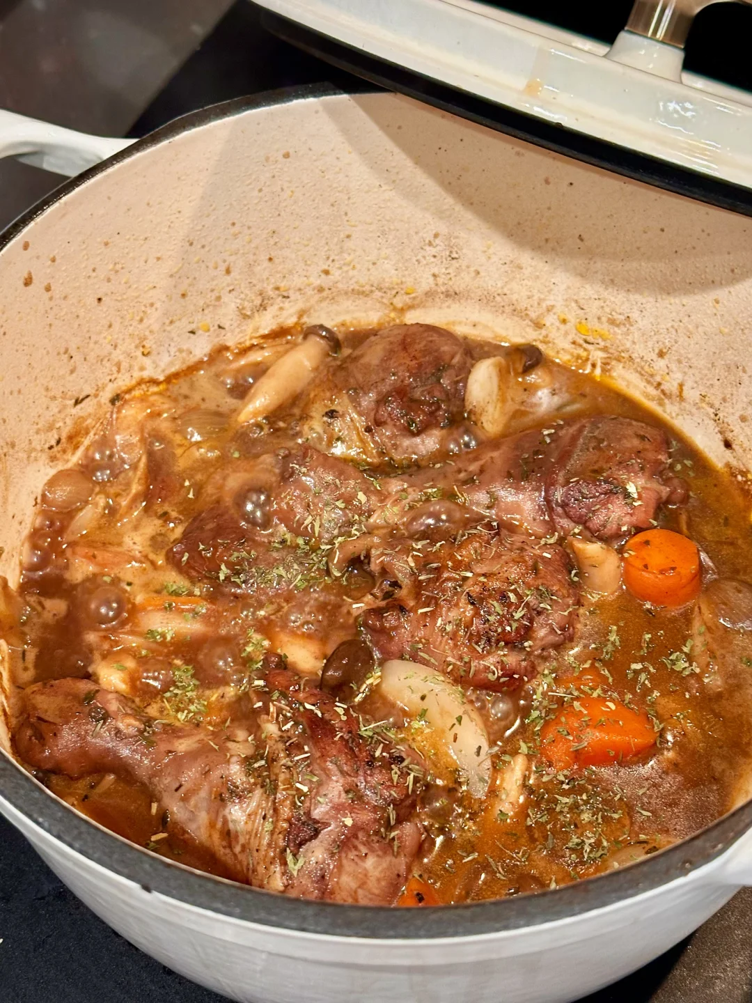 沿用了经典法餐coq au vin的做法,鸡腿先用红酒隔夜浸渍,再用培根油脂煎香后炖煮,这能不好吃嘛!