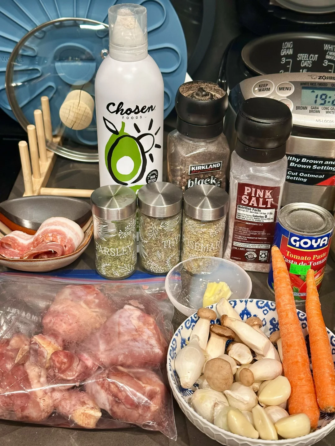 鸡腿四个,红酒1cup,盐和胡椒适量,培根三片(如果有传统lardon更好),黄油一小块,胡萝卜两小根,洋葱半个,蒜两瓣,番茄膏一大勺,迷迭香和百里香适量,鸡高汤或清水,生抽一大勺,珍珠洋葱,迷你杏鲍菇,年糕片,水淀粉一小碗。