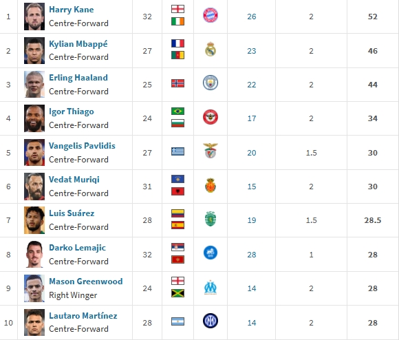 1.凯恩(拜仁)26球52分