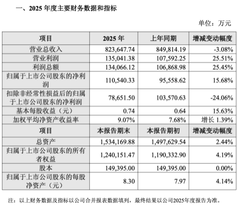 2025年业绩预告显示,天士力全年营收82.36亿元,同比下滑3.08%;归母净利润11.05亿元,同比增长15.68%;但更能反映主营业务真实成色的扣非归母净利润为7.87亿元,同比大幅下降24.06%。