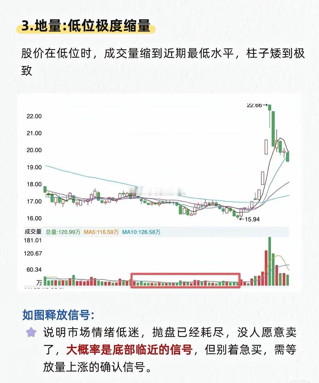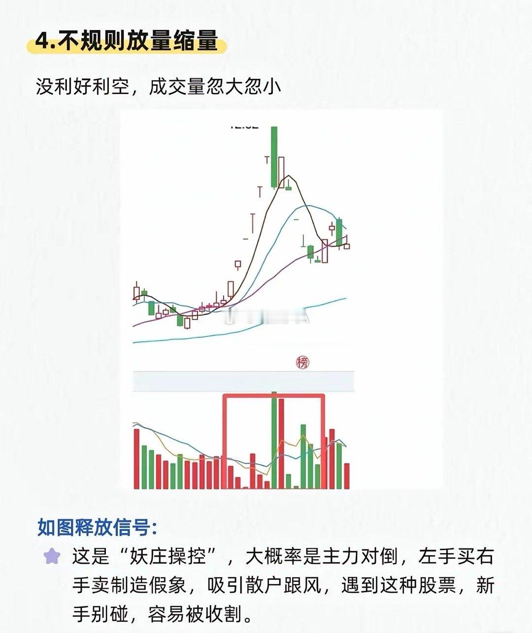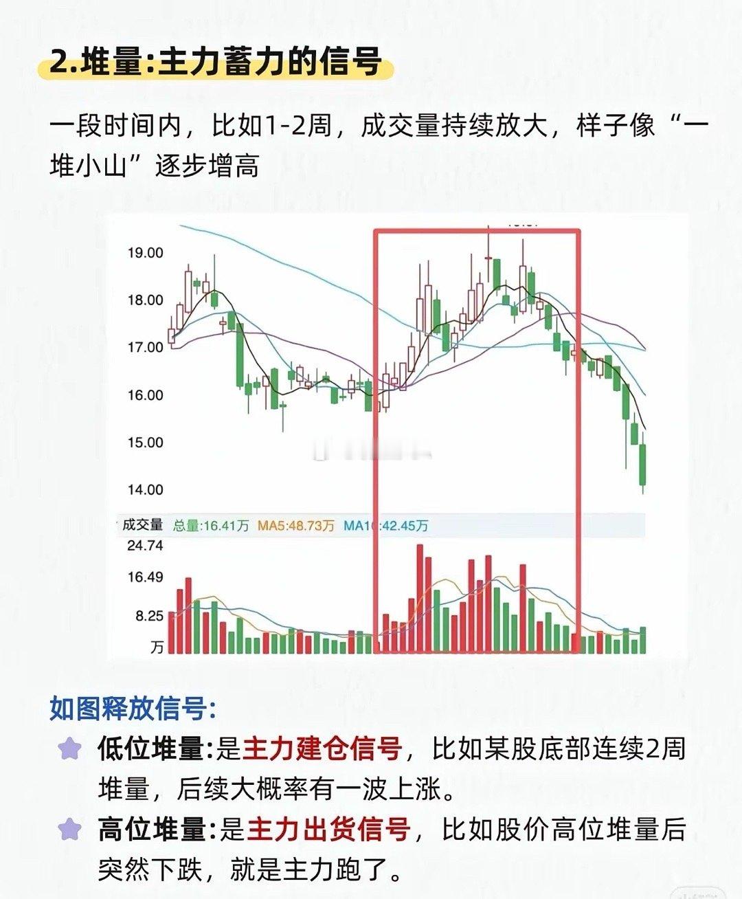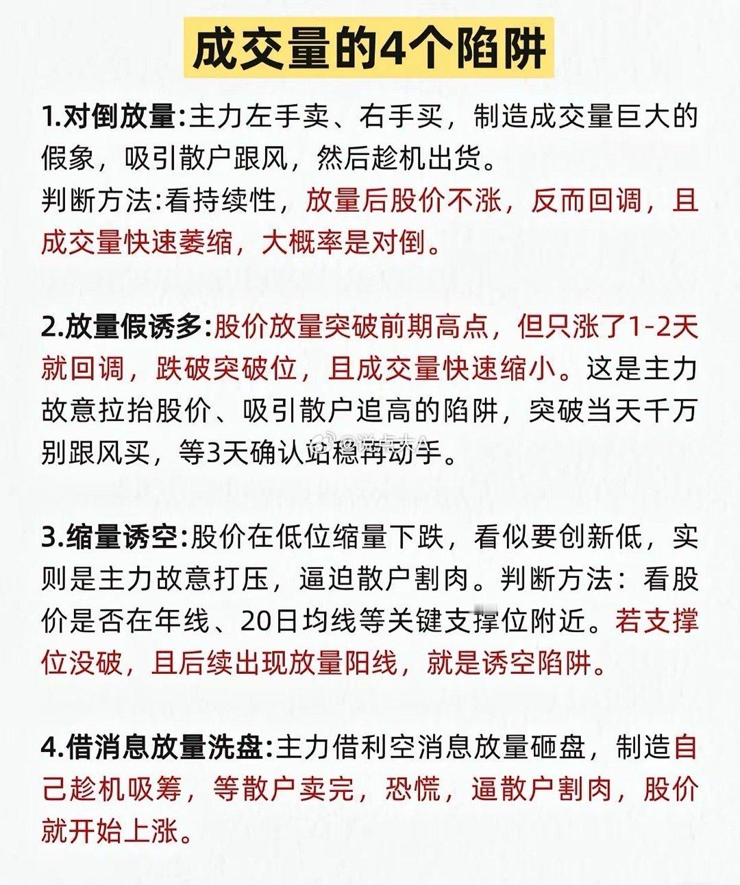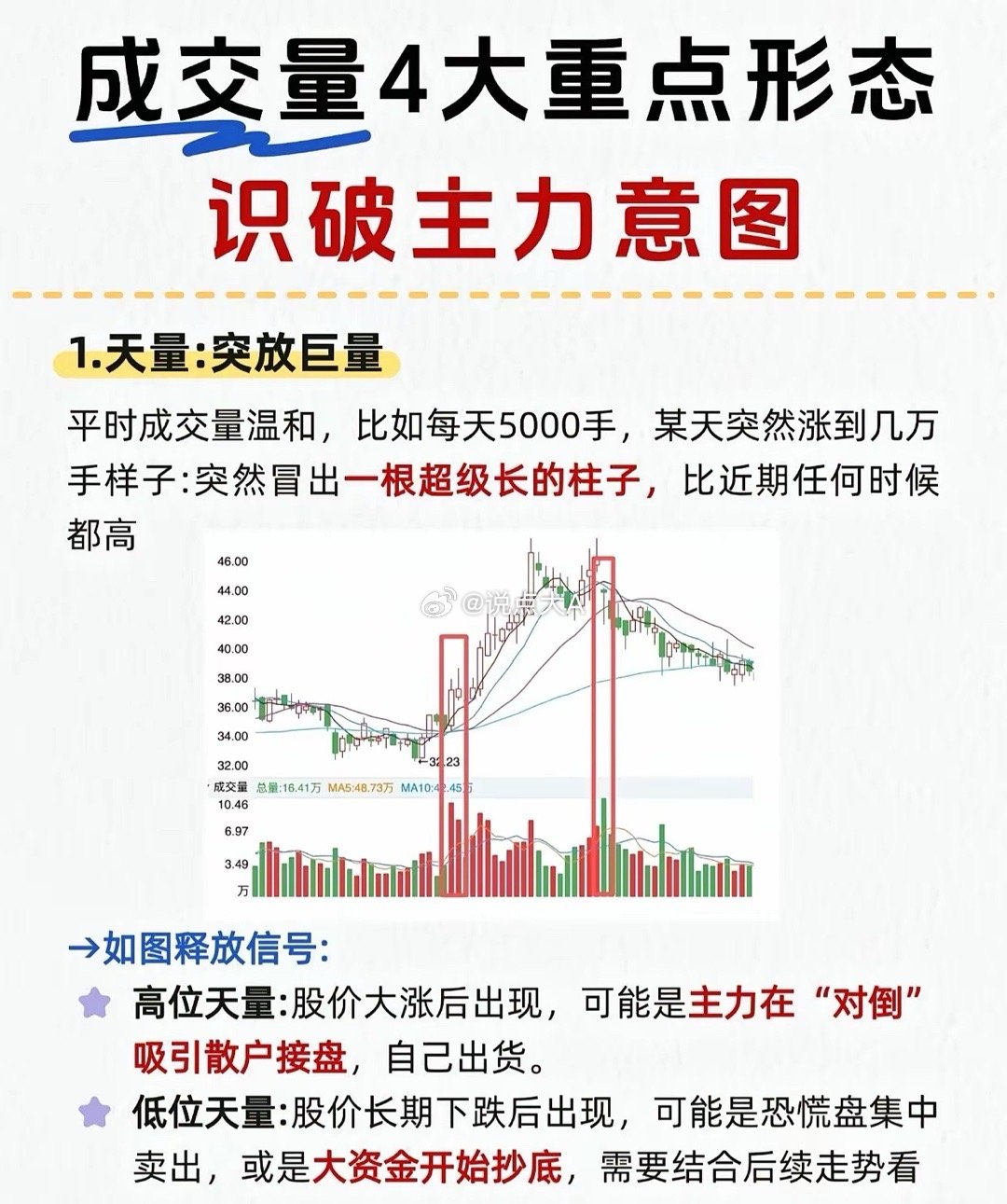 1️⃣ 天量(突放巨量)- 特征:平时成交量温和,某天突然大幅放大,柱子极高。- 高位天量:大涨后出现,可能是主力对倒吸引散户接盘并出货。- 低位天量:长期下跌后出现,可能是恐慌盘卖出或大资金抄底,需结合后续走势判断。2️⃣ 堆量(主力蓄力信号)- 特征:1-2 周内成交量持续放大,像“小山”逐步增高,量价齐升。- 低位堆量:主力建仓信号,后续可能上涨。- 高位堆量:主力出货信号,随后可能下跌。3️⃣ 地量(低位极度缩量)- 特征:股价低位时成交量缩至近期最低,柱子极矮。- 信号:市场情绪低迷、抛盘耗尽,可能是底部临近,但需等放量上涨确认才买入。4️⃣ 不规则放量缩量- 特征:无利好利空,成交量忽大忽小。- 信号:多为“妖庄操控”,主力对倒制造假象吸引散户,新手应避免。5️⃣ 成交量的 4 个陷阱1. 对倒放量:自买自卖造巨量假象,放量后股价不涨反跌。2. 放量假诱多:假突破后快速回调,跌破突破位。3. 缩量诱空:低位缩量跌似新低,实为打压逼散户割肉。4. 借消息放量洗盘:借利空砸盘吸筹,随后上涨。📌 核心要点:- 天量、堆量、地量是量能变化的典型形态,可辅助判断主力动向和买卖时机。- 不规则放量缩量和四大陷阱提醒投资者警惕主力操控和假信号,避免被套。