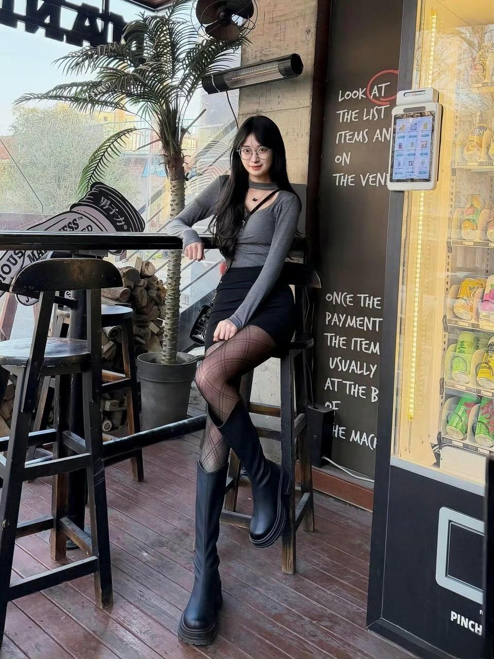 这套穿搭是“甜酷辣妹风”的典型范本!灰调镂空上衣,黑短裙添了复古酷感,厚底靴直接