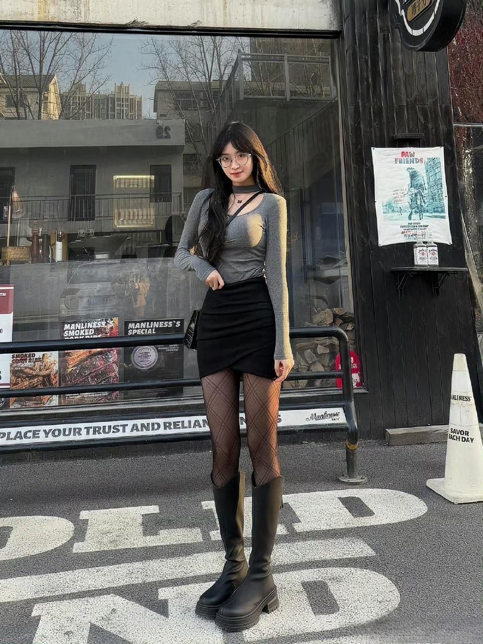 这套穿搭是“甜酷辣妹风”的典型范本!灰调镂空上衣,黑短裙添了复古酷感,厚底靴直接把帅气值拉满,街头背景里显得又飒又有辨识度~灰调轻熟风穿搭