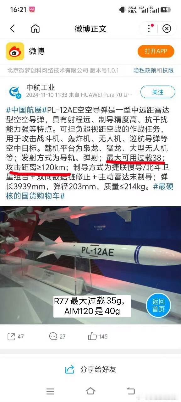 烽火问鼎计划武器装备全球武器装备盘点 ➡️近期外媒曝光了R77M详细参数(图1),显示R77M最大射程103海里/约191公里,、最大速度4.5马赫、最大过载30g,➡️根据图2对SD10总师的访谈,俄国标定空空导弹射程一般取2万米高度对迎头1.5马赫对头飞行目标的总拦截距离,也就是俄标射程191KM=R77M在2万米高度发射最大速度4.5马赫➕靶机在2万米高度以1.5马赫速度对头飞行的航程,两者相对速度之和达到6马赫。那么做一个考虑空气密度、速度?高度的换算● 已知工况(高空): 高度20000米,目标速度1.5马赫,射程190.76公里/103海里)● 待求工况(中空): 高度10000米,目标速度1.2马赫。推算逻辑与修正:1. 空气密度与阻力的影响(最核心因素): 导弹在低空飞行时,空气密度远大于高空。根据国际标准大气模型:● 在20,000米高度,空气密度极低,仅为海平面的约5.5%。● 在10,000米高度,空气密度显著增加,约为海平面的26%左右,是20,000米高度空气密度的近5倍。 这意味着,在10,000米高度,导弹飞行时受到的气动阻力会急剧增加。为了维持速度,发动机需要消耗更多的燃料来克服阻力,或者导弹的速度衰减会更快。通常,对于这类导弹,从20,000米降到10,000米,由于阻力增加,射程会受到显著压缩。经验数据显示,这种高度下降导致的射程损失可能在30%到40%之间。2. 相对速度的影响:● 已知工况: 假设导弹速度为4.5马赫(如图中所示最大速度),目标1.5马赫,迎头攻击,相对速度为6.0马赫。● 待求工况: 导弹速度在低空会受限于阻力,可能无法达到4.5马赫的最高速度,假设其有效攻击速度约为3.5-4.0马赫。目标速度为1.2马赫,相对速度约为4.7-5.2马赫。 相对速度的降低(从6.0马赫降至约5.0马赫)意味着导弹与目标的接近时间变长,飞行时间增加。在低空阻力大情况下,飞行时间越长,速度衰减越严重,射程进一步缩短。3. 发动机性能与能量管理: R-77M作为双脉冲发动机导弹,其能量管理策略会影响射程。但在低空,发动机的进气效率和燃料消耗率都会发生变化。由于空气密度大,发动机推力可能略有增加,但燃料消耗率增加得更快,导致比冲下降,整体能量效率降低。⭐️综合估算:考虑到10,000米高度的空气密度是20,000米的近5倍,阻力大幅增加,同时目标速度降低导致相对速度下降,飞行时间变长,速度衰减更严重。综合这些因素,射程会有显著下降。● 阻力因素: 导致射程缩减约35%。● 相对速度因素: 导致射程缩减约15%。● 综合效应: 两项叠加,射程可能缩减至原射程的50%左右。 因此,R-77M在10,000米高度对1.2马赫对头飞行目标射程估算约 95~110公里之间。➡️以上射程用R77复盘验算。图2显示梁总认为R77射程俄标100KM未必优于GJB射程70KM的SD10,因为中国GJB射程标定条件是在1万米高度打击1.2马赫对头飞行目标。那么国内对R77按GJB标定射程多少呢?答案恰好是50KM(衰减50%),图3为第一次中泰军演复盘讲座PPT可以佐证。因此,可以确定同一款导弹GJB射程一般比俄标射程小50%左右。➡️图4是PL15总师标定AIM120A射程75KM/过载40g、R77射程69KM(用户写50KM)/过载35g、图5证明PL12AE最小攻击距离120KM/最大过载38g,图6证明印巴空战大显神威在124.7英里/200KM外击落阵风的PL15E国内标最小攻击距离145KM/最大过载40g,而图1俄R77M导弹仅30g最大过载、这意味着它的格斗能力远不如AIM120和PL15、甚至不如R77,R77又不如PL12AE。⭐️这从侧面证明了采用了双脉冲技术的R77M弹道优化偏远界而非近界、缺乏栅格舵大幅降低了R77M至少5g过载。 ➡️图7的R77射程包线坐标点就是一万米高度对应不到50KM射程。图8可以对比PL15对R77形成的巨大代差。➡️另一个关于俄标射程比GJB虚高1倍的证据是R37M,其外贸型号RVVBD射程标最远200KM对应最大发射速度2.8马赫(这发射初速度只有数值怪米格25/31能做到,一般初速度越高才能打出最远射程)。很显然高空高速不如米格31的苏35、苏57是不可能达到这射程的。此前国内以讹传讹的213KM击落乌军战机当时就有2种说法(S300V或R37M),英国皇家军种联合研究院信源说的R37M击落但射程纪录是177KM(图18),低于PL15E在印巴空战创造的200KM纪录。俄一贯宣传R37M最大射程150~400KM,但在外贸出口型RVVBD展板上很老实标的200KM,参考图10~图12,R37M实战发射距离在7890米高度115KM,在10010米高度120KM,最高值192KM是高度不明速度不明的发射,以RVVBD展板推测应该是米格31打的,没有一个超过200KM,足以证明俄标400KM的R37M按GJB就是缩水50%跌到200KM。➡️图13~图15是美国最新锐的AIM260A空空导弹,研制公司洛马提过有Gan导引头,但定型明显晚于在2025年57空战被实战残骸证明有AESA导引头的PL15E,R77M同样使用了AGAT设计局的9B1103M2 ka波段导引头。三者都是AESA中远程空空导弹,只不过R77M射程和近距离格斗能力最差。空导院认定AIM260A射程265KM、AIM120D射程约183KM,结合图16王总访谈可证明AIM120D在未采用双脉冲技术下仅通过5种增程技术(图17)就轻松达到了接近PL15射程大于200KM。美军标一般用1万米高度0.9马赫对头飞行靶机标定射程比GJB更严格。⭐️综上所述:一般俄标射程减半就是GJB射程,从给俄友面子的角度可以设定为50%~69%,那么R77参数按GJB衡量在95~132KM,最大过载30g垫底甚至不如R77、最大速度4.5马赫还是不错的指标、综合相当于改装AESA导引头的PL12AE或AIM120C5~AIM120C7,相比50KM实用射程的R77或者75KM射程的R77-1提高了27%~76%。➡️未来苏35SK如果存在改进计划、进口R77M是省钱捷径提高到能BVR对抗挂AI
