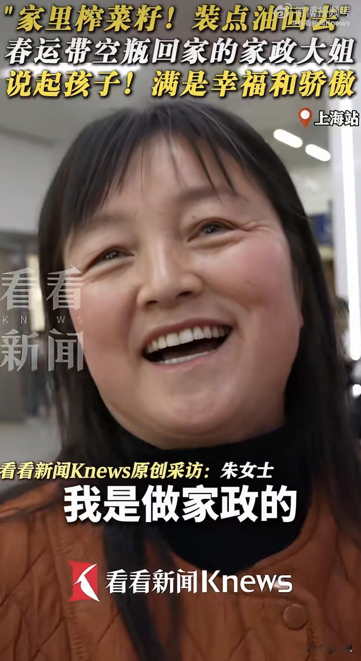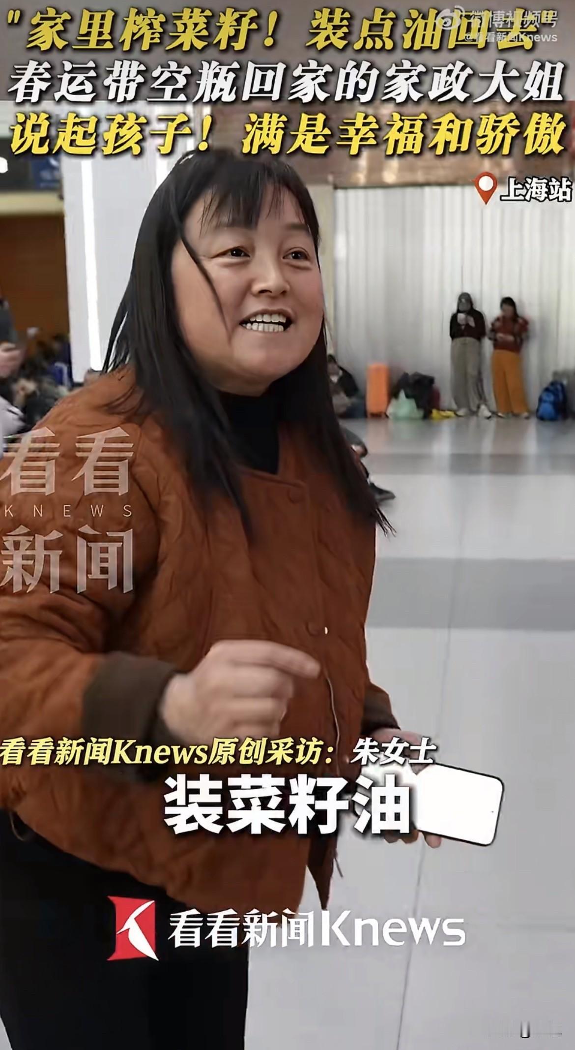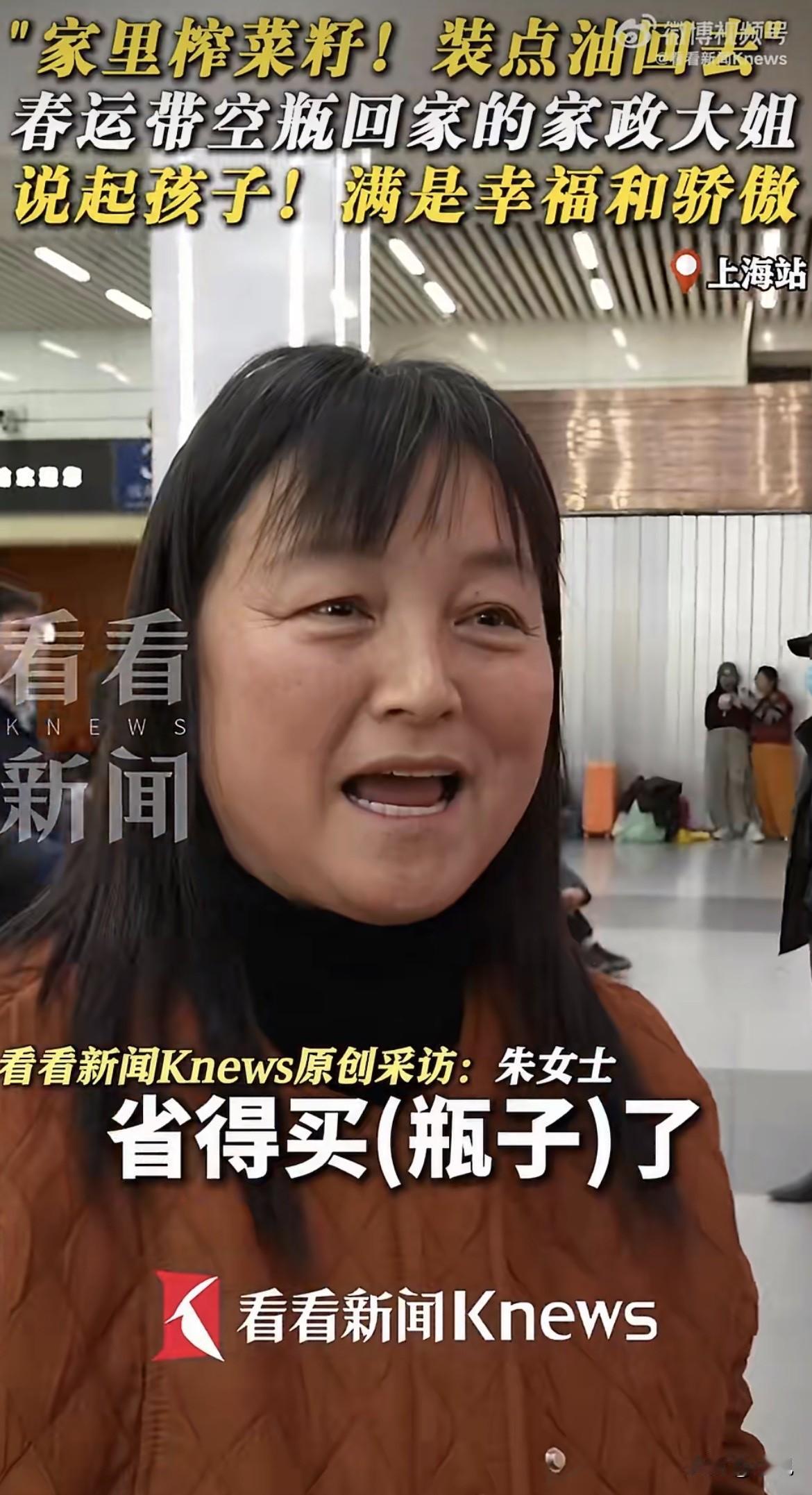 你发现没有,春运火车站,有人扛着编织袋,有人拖着行李箱。但上海站这位大姐,手里拎着的东西,让好多人多看了两眼。 四个空矿泉水瓶。就是那种5升的大瓶子,透明塑料的,里面空空荡荡,连水都没有。她就这样拎着,过了安检,进了候车室。 记者也觉得稀罕,凑上去问。大姐笑了,笑得特实在:带回去装家里自己做的菜籽油啊。 就这一句话,什么都明白了。城里喝完水就扔的瓶子,在她眼里是宝贝。老家榨的油,香,浓,买都买不到。带空瓶子回去,装满油再带回来。这一来一回,几千公里路,就为了那口家乡味。 可接下来她说起孩子,那才叫真的不一样。 语气一下子就变了。不是那种轻飘飘的随口一提,是憋不住的高兴,是那种你不问我也想说给你听的骄傲。 孩子上大学,三年了,没往家里要过一分钱生活费。不仅不要钱,自己跑外卖,硬是攒下了五万块。 五万块啊。有人说现在五万块能干吗?可你得算算,一个大学生,上课之外的时间,一单外卖几块钱,刮风下雨不能停,跑多少单才能攒下五万?这孩子三年没跟家里伸过手,每个月还得往存折里存一千多。一千多块,是他一单一单跑出来的,是凌晨的订单,是午夜的夜宵,是别人在宿舍打游戏他在外面吹冷风换来的。 大姐说这句话的时候,眼睛亮亮的,脸上的笑压都压不下去。她说,我很幸福的。连着说了两遍。 她说得很轻,可听到的人心里都重了一下。 四个空瓶子,装的是家乡的味道。一句我很幸福,装的是一个母亲全部的满足。这满足不是因为孩子赚了多少钱,是因为孩子懂事,独立,不让家里操心。这比给她买什么都强。 当然,网上也有人提醒,说这种PET塑料瓶装油不好,遇油脂可能析出有害物质,最好用玻璃罐或者陶瓷罐。这话是好意,是科普,没错。 但那一刻,看着大姐拎着四个空瓶站在人山人海的火车站,谁忍心去说她?那四个瓶子干干净净,是她从上海带回去的念想,是她给老家的油准备的容器。她不是不懂,她只是觉得,这瓶子扔了可惜,带回去正好能用。这是过日子的脑子,是一分钱掰成两半花的人才会有的算计。 她干家政,给别人家打扫卫生,收拾屋子。别人家扔掉的空瓶,她攒下来,带回家。这东西不值钱,可她看重的是它还能用,还能装好东西。 孩子在学校送外卖,一单几块钱地挣。她在家政公司接活,一家一户地干。娘俩一个在上海,一个在上大学的城市,都在用自己的方式撑着自己,不拖累对方。这是最普通的人家,最朴素的双向奔赴。 火车站里人多,声音杂,大姐说完话,拎着她那四个空瓶往检票口走。瓶子晃晃悠悠的,看着有点可笑,又有点心酸。 可她脸上的笑是真的,那股骄傲是真的。这趟车开回去,老家有人等着她,有菜籽油的香味,有让她骄傲的孩子。她就这么拎着四个空瓶,走进了人堆里,走进了春运的大潮里。 日子苦不苦?肯定苦。可她不说苦,只说幸福。 你看,幸福有时候就这么简单。不是有多少钱,是孩子争气,是家里人好好的,是手里这四个空瓶,回去能装满家乡的油,再带回来。 你觉得呢?