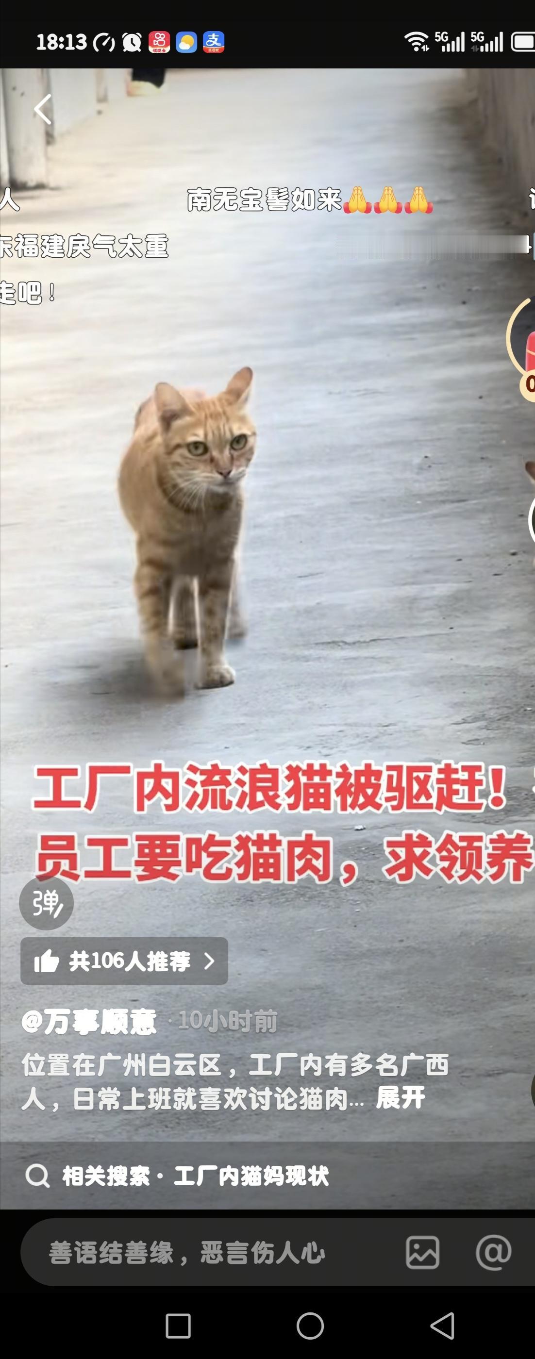 工厂内流浪猫被驱赶!有员工要吃猫肉,求领养! 位置在广州白云区,工厂内有多名广西人,日常上班就喜欢讨论猫肉