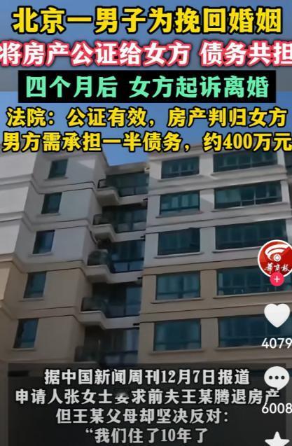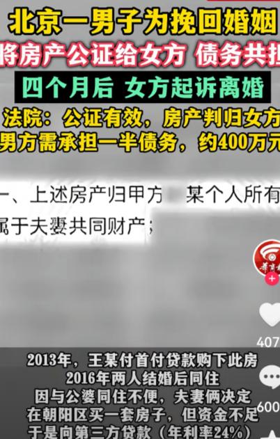 北京,男子首付买下一套房,婚后,又另外买了一套房,因还贷压力太大,他和妻子爆发矛盾。一度提及离婚。随后,女方提出婚内财产公证。2套房都归她所有,债务由双方共同分担。男子为挽回婚姻,瞒着父母配合公证。不料4个月后,女方起诉离婚,法院判决让男子悔之莫及。 几年前,王大哥用多年积蓄付了首付,买下了属于自己的小房子。那时,他和张女士刚结婚,生活简单而踏实。房子虽不大,但温馨,仿佛可以装下两个人所有的梦想。 他记得第一次带张女士去看房时,她眼里闪烁的光芒,说:“小点没关系,只要是我们的家。”那一刻,他以为自己找到了生命中最合适的人。 然而,生活总是比想象复杂得多。婚后没多久,张女士便开始觉得生活里的每一件事都不尽如人意。 王大哥辛苦买下的那套小房子,在她眼里似乎总有缺陷:客厅不够宽敞,孩子放学回家时常常打闹,连楼下的杂货店都要走上十几分钟 每次带孩子去小区附近的学校,她都觉得路途太远,孩子累,她自己也累。每次她抱怨,王大哥总是一笑置之,说“这也算不错的起点了”,可她心里却越发积累着不满。 一天晚上,张女士坐在餐桌旁,把手里的账单摊开,一边算着孩子的学费、一边计算房贷的支出,她忍不住叹气:“王大哥,这房子小,孩子住着不方便,你看楼下那套新房,离学校近,阳光也好,要是我们能换一套就好了。” 她的语气里有着压抑已久的无奈和焦虑,但也掺杂着一丝期待。 王大哥沉默着,能感觉到妻子的抱怨并非无理,只是每一句话都像在提醒他肩上的压力有多沉重。 张女士眼神里闪烁着渴望,她放下笔,靠在椅背上,轻轻揉着额头,低声说:“我手里还有些积蓄,如果能再买一套房,孩子就能有自己的房间,生活也方便些,我觉得这是值得的。” 她的声音带着祈求,但也有着一丝不容忽视的坚定。 几天后,她开始主动联系房产中介,看房、比价、问学区、考察交通。每一次带王大哥去看房,她都会细致地指出房子优缺点:“这套阳光不错,但客厅太小;那套离学校近,可交通不便。” 她的语气里既有抱怨,也有计划和决心。王大哥只能默默点头,心里清楚,她已经把这件事当作必行之事。 最终,她提出了通过第三方贷款来筹资,年利率高达24%。 王大哥一听,心里顿时紧绷,但看到她眼中期待的光,他仍然选择默默签下文件。 张女士似乎一点也不在意高额利息,她的脸上只有兴奋和对未来生活的憧憬:“只要能让孩子生活得更好,一切都值得。” 随着贷款落地,压力开始像潮水般漫过生活的每一处缝隙。每天,他都在为还款计算着账单,每个月的工资几乎都用在还贷上,夫妻间的争吵也越来越频繁。 张女士抱怨王大哥不懂她的苦心,王大哥则认为她不体谅自己。一次又一次的争吵,使他们的感情逐渐裂开。 终于,有一天,张女士冷冷地抛出一句话:“要是不离婚,你就把房子都过户给我。”王大哥整个人愣住了。他不想离婚,却又害怕失去家庭。 他思索良久,决定妥协——为了挽回婚姻,他竟然瞒着父母,配合妻子完成了公证手续。 两套房子就这样过户到了张女士名下,而贷款债务,则以夫妻共同债务的名义登记,王大哥心里默默告诉自己:“只要不离婚,就值得。” 四个月后,张女士递交了离婚诉讼。王大哥第一次感到世界彻底崩塌。 法庭上,法官的判决如冰水般冷漠:“公证有效,房产归女方;债务虽由女方还清,但属于夫妻共同债务,男方需承担一半。”一纸判决,王大哥需要偿还约400万元。 更让王大哥崩溃的还在后面。判决生效后,张女士几乎不给他任何喘息的机会。她要求他立即腾退房产,把曾经属于他们夫妻的家彻底交出。 王大哥站在空荡荡的屋子里,看着墙上那张婚纱照,心里五味杂陈——曾经的欢笑、争吵、甜蜜,如今都像被风吹散的尘埃,只剩下冰冷的现实。 王大哥尝试联系律师,想要缓一缓,争取多一点时间,但法律的执行没有感情可言。 他每天都在想着如何筹钱偿还债务,如何找地方住下,甚至连夜里都无法入睡。他开始后悔自己的妥协,后悔曾经为了挽回婚姻而放弃理智,甚至后悔没有听从家人的劝告。