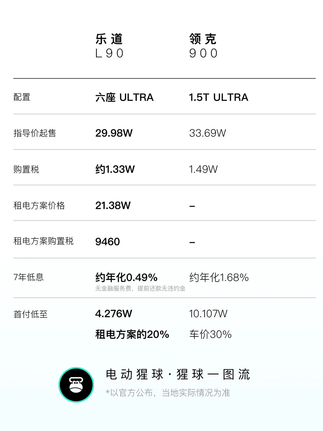 3️⃣价格和首付:两款车都支持7年低息,乐道7年0.49%的超低息金融方案是银行直贷,还有0️⃣金融服务费,提前还款0️⃣违约金,7年能省下至少2万利息,还有4.1万综合权益,现在入手乐道L90 Ultra租电方案,不用买电池,车价少8.6万,首付4万多,日供不到90,省去电池购置税;领克900的年化利率约1.68%,1.5T Ultra版首付30%约10万多,日供100多,有1.5万元限时购置税补贴、0元享至高2.5万选装配置等权益可选(以当地实际情况为准)
