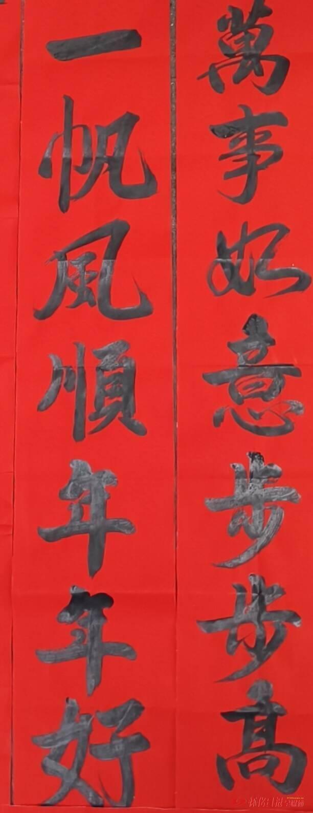 现场只见她凝神运笔,起收有度、墨色饱满,“马到成功”“五福临门”“家和万事兴”等吉祥语句一气呵成,刚柔相济、意蕴深长。不少赶场市民驻足围观、争相领取,连连称赞少年功底扎实。接过红彤彤的春联,大家脸上洋溢着笑容,直言这是最有年味、最有心意的新春礼物。