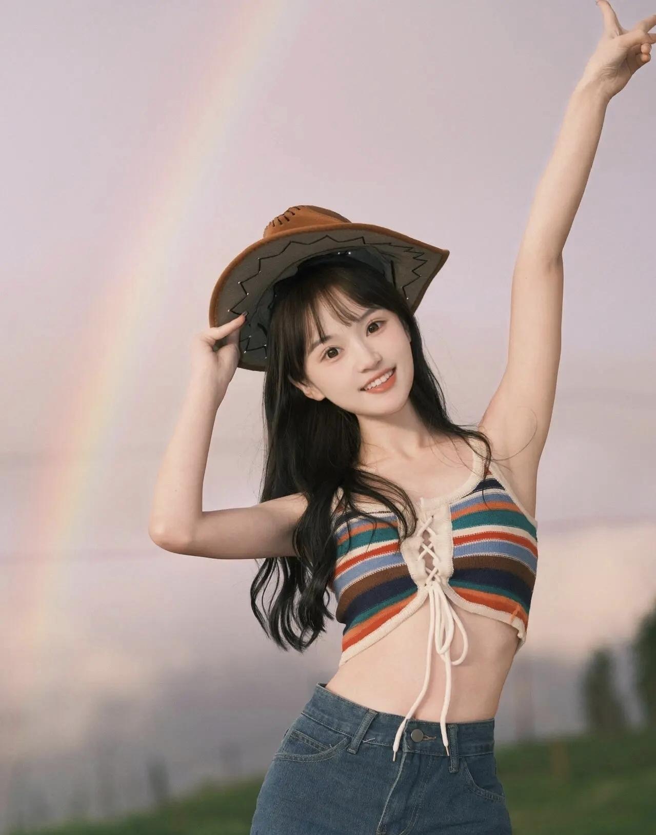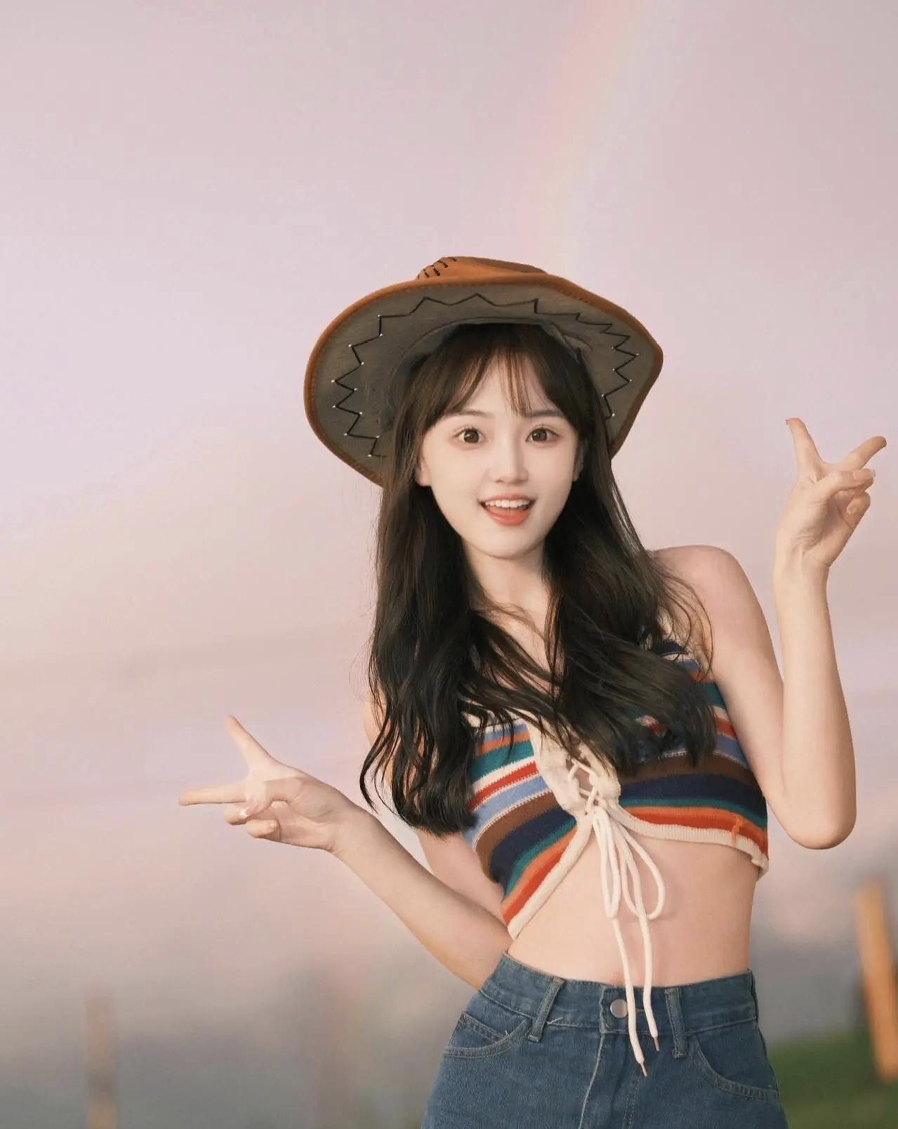 牛仔少女,牛仔帽和条纹背心,青春活力满满!🌈👒👗