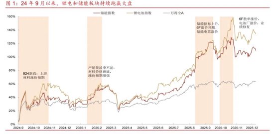 “从2024年9月以来,锂电与储能板块展现出了显著优于大盘的超额收益,行业正在逐步确认周期的地步拐点”。华西证券分析师指出,整个板块在经历“924新政”修复后,2025年逐步开启上行通道,尤其是进入下半年,驱动逻辑更加清晰:随着上游材料涨价预期的强化、储能招标需求的明显回暖以及电池环节价格体系的企稳,供需两侧形成了共振,“板块复苏不再仅限于上游价格与业绩修复的存量博弈,而是叠加了储能新需求的强力拉动”。