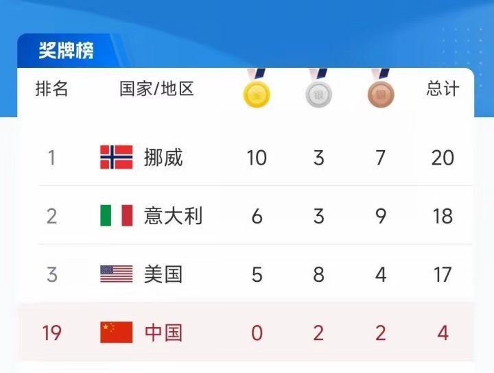 赛事已过半!冬奥奖牌榜:中国0金2银2铜第19 第1挪威10金美国5金体育明星米兰冬奥会中国队比赛项目汇总