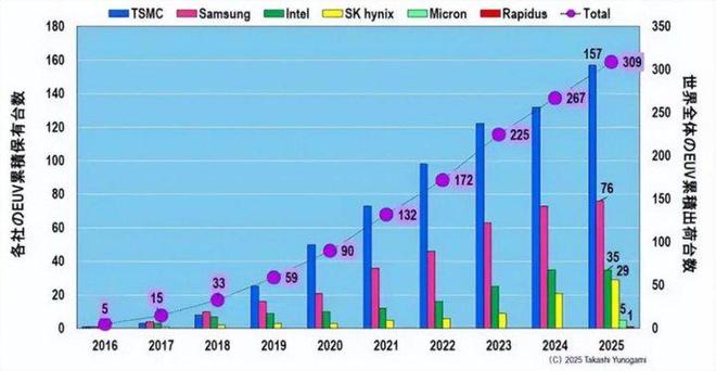 自ASML在2016年正式量产EUV光刻机以来,这十年间全球累计交付的EUV设备约为309台。其中,台积电独占157台,占比高达50.8%——全球一半的EUV产能都被这家中国台湾代工厂收入囊中。紧随其后的是三星,其工厂内部署了76台EUV;Intel则拥有35台,SK海力士29台,美光5台,而2022年才成立的日本Rapidus公司,也拿到了1台EUV作为先进制程布局的起点。