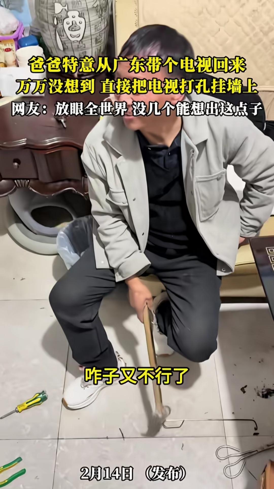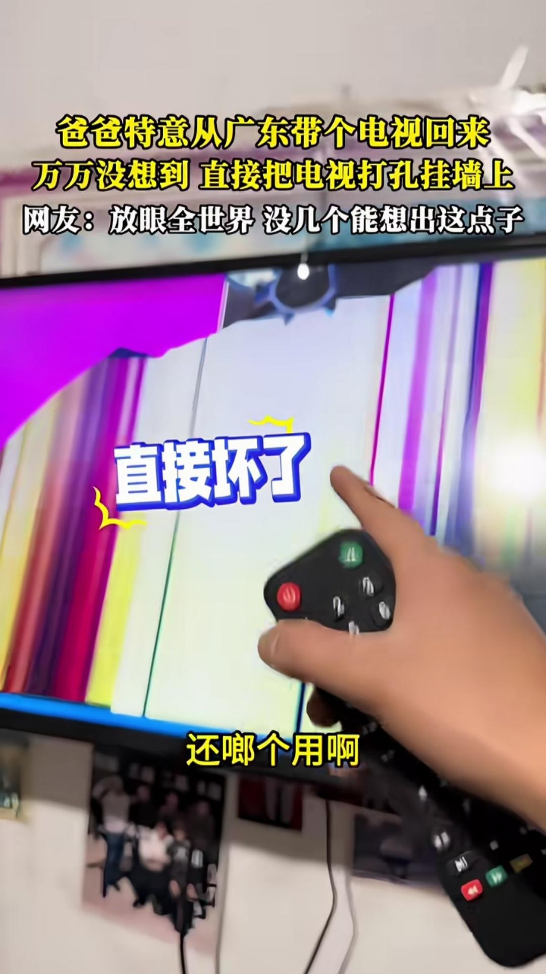 在面板上开洞,用铁丝穿进电视将其挂起来看,这样的电视还能正常观看吗? 近日,一位网友分享了一段视频,视频内容讲述的是他家发生的事。 原来,他爸爸特意从广东带回一台电视,安装时犯了糊涂。任凭家人怎么劝告,他都当耳旁风,非要在电视面板上开洞,用铁丝把电视挂起来。可打开电视后,画面满是杠条,很明显,电视已经被弄坏了。 看来,电子产品是经不住磕碰的! 电视打眼