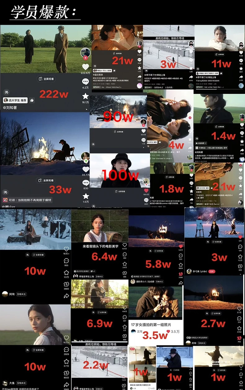 今年的面授计划已经做好啦 至今为止已经开了9期面授了,每一期面授都会有很多大大小小的爆款,也带着学员不止一次的做出了某音百万点赞,50w➕点赞的大爆款。 有学员从0粉到千粉到大几万粉甚至到十几万粉,客单价格从几百涨到几千,甚至只靠接广就可以月入两三万。 多的就不说啦 要审美我这里有,要作品要流量我这里同样有