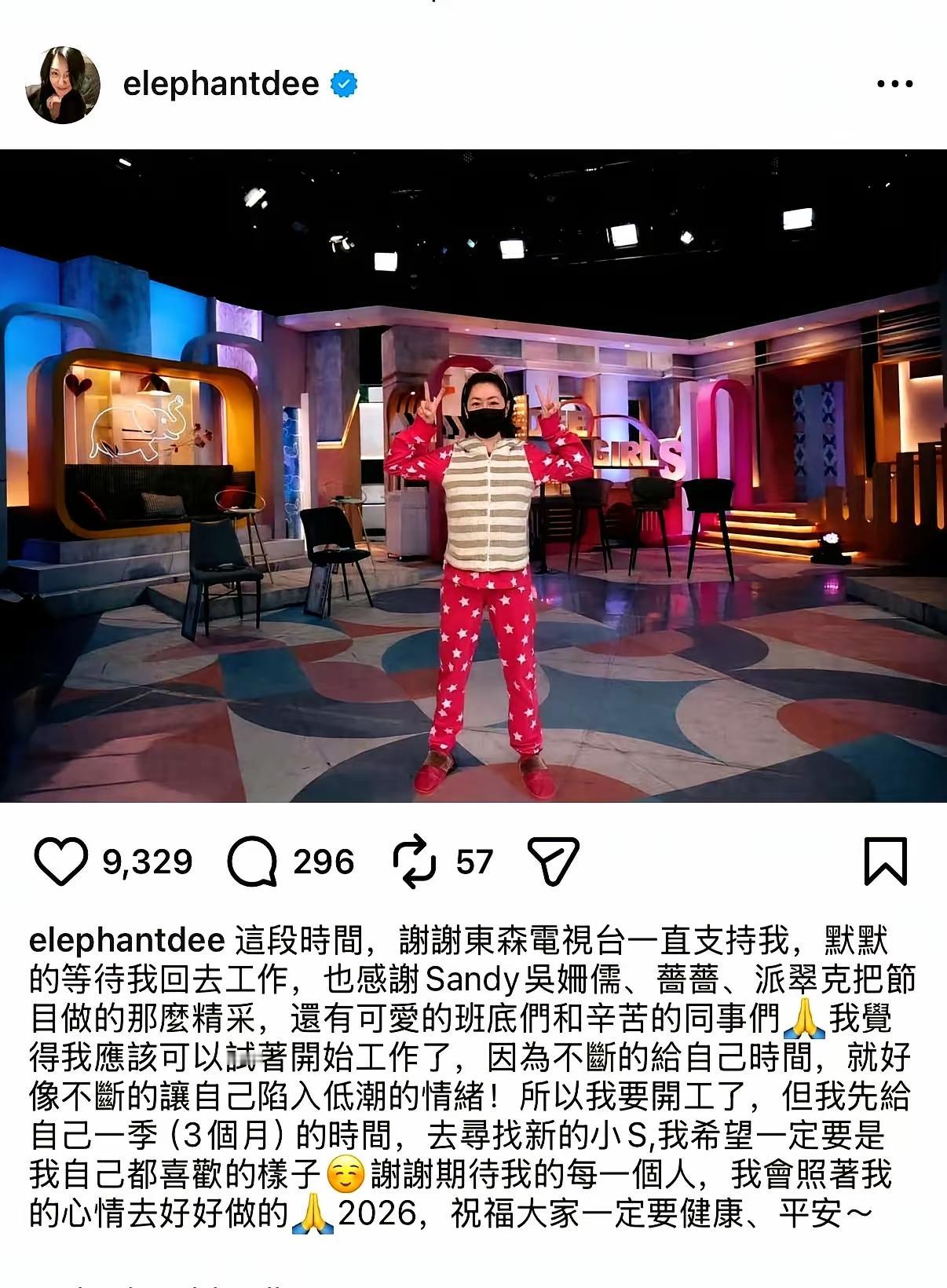 小S终于复工了。 因为大S突然离世,小S伤心到无法工作,所以请了吴姗儒代班。