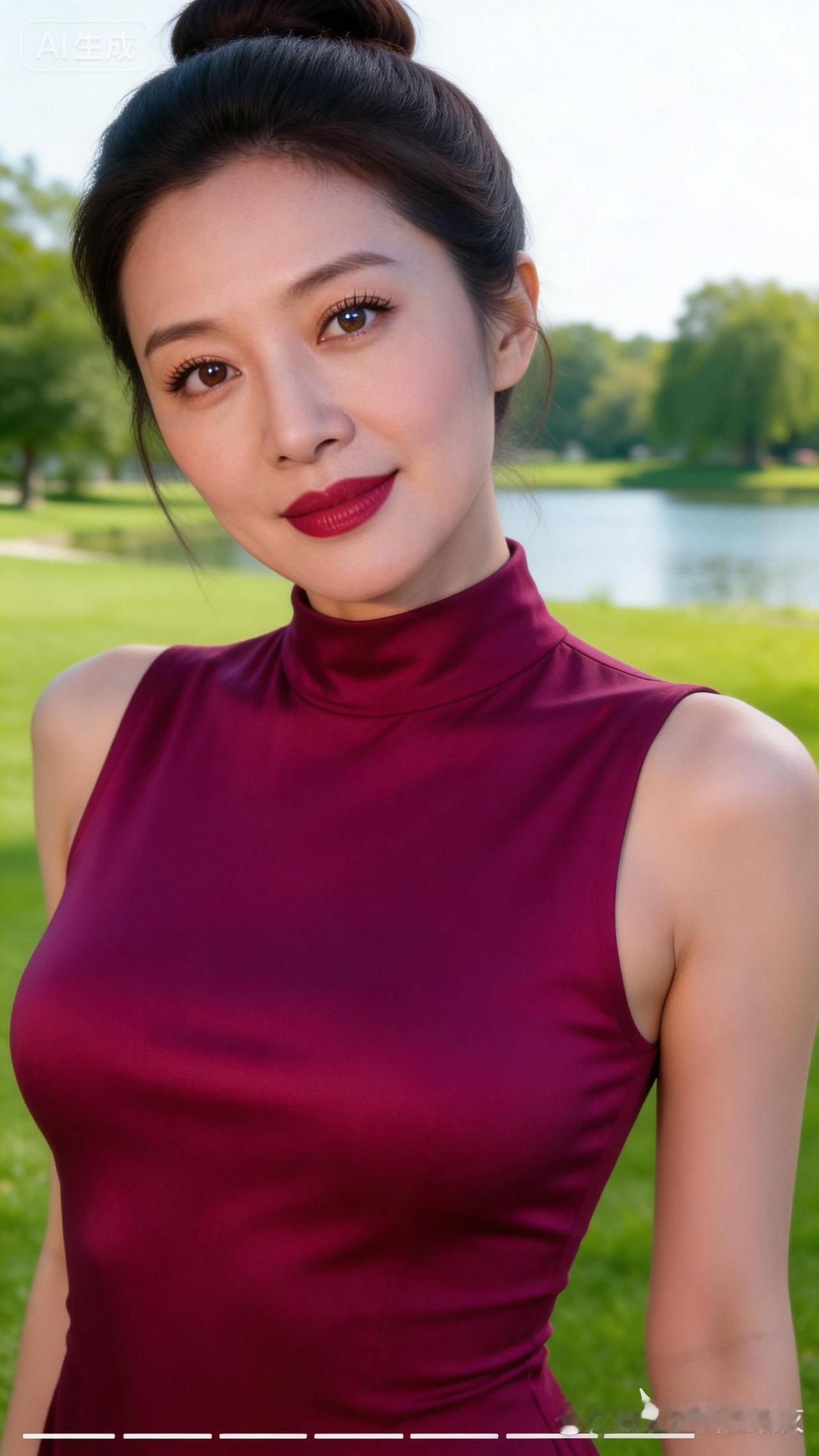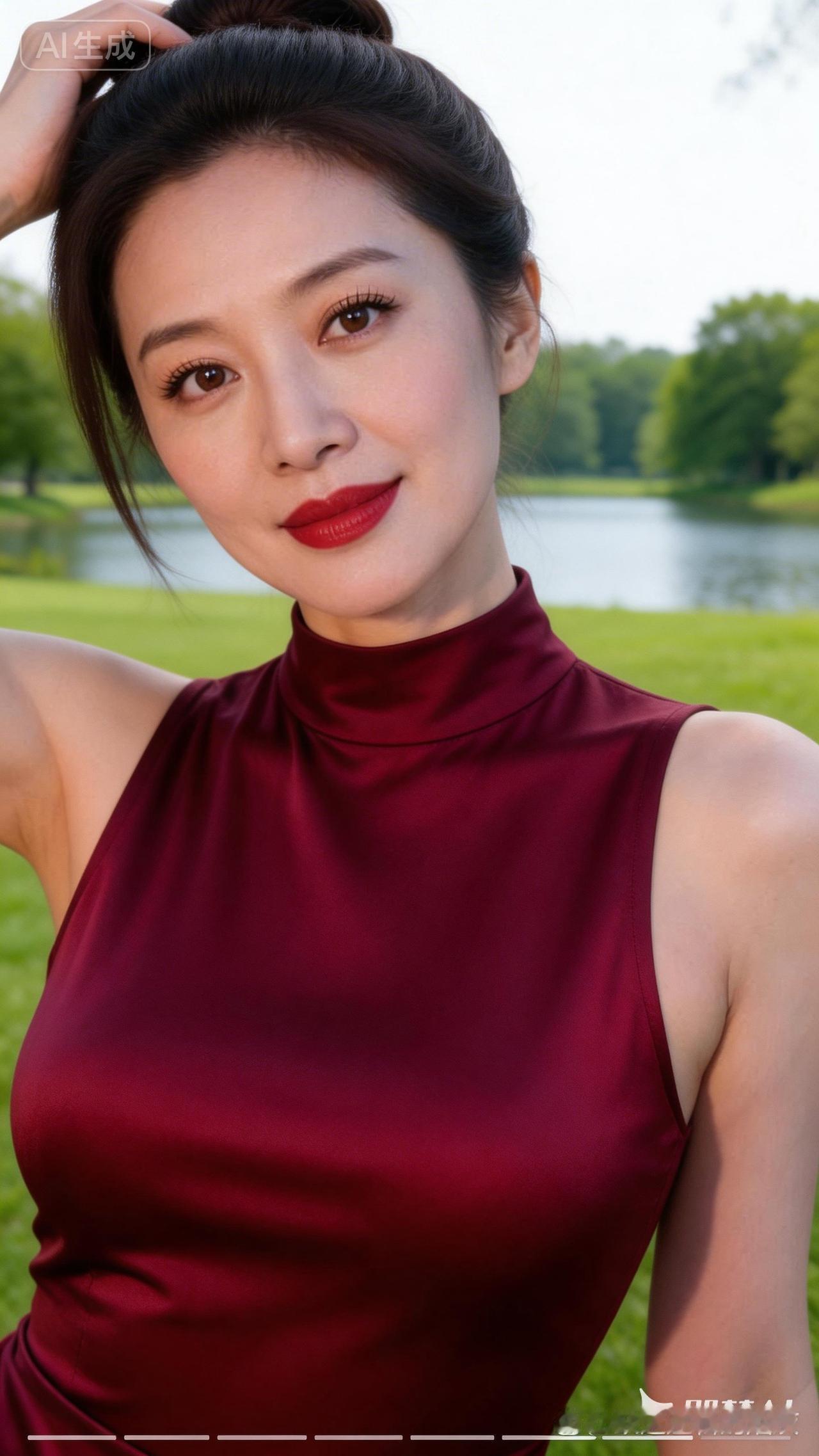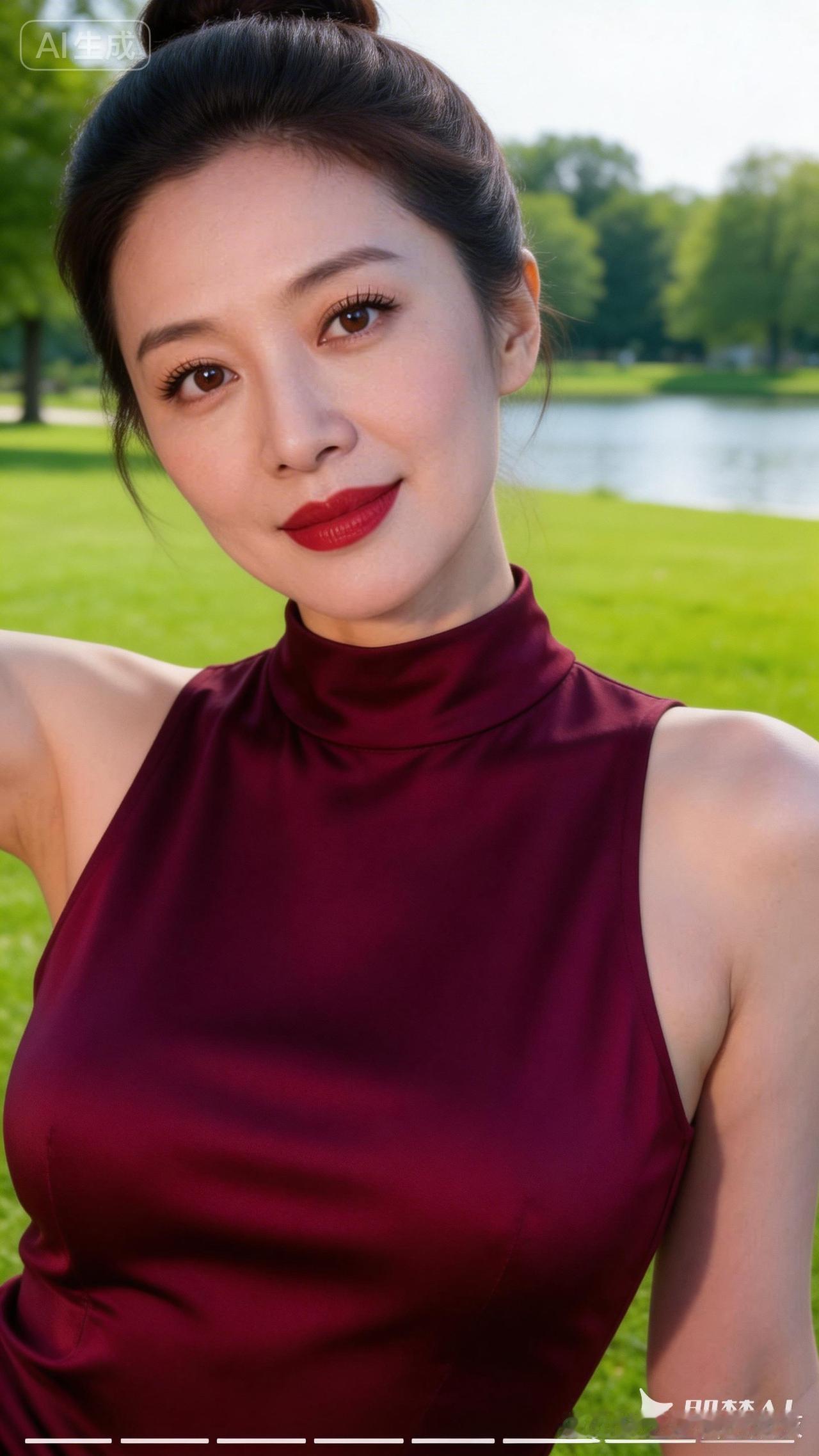 优雅红衣,自然绿意,公园里的美丽瞬间