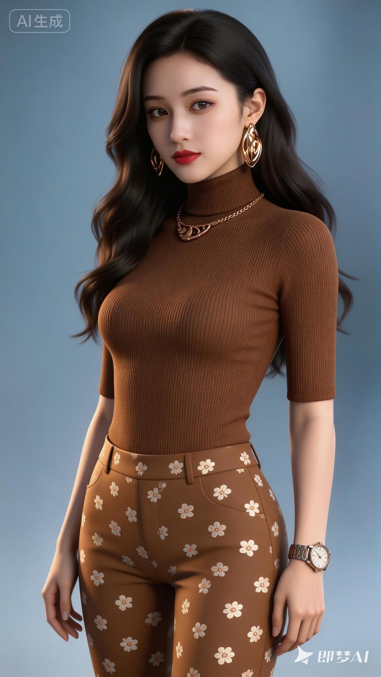 优雅气质穿搭,棕色高领毛衣搭配花卉长裤,尽显时尚魅力!