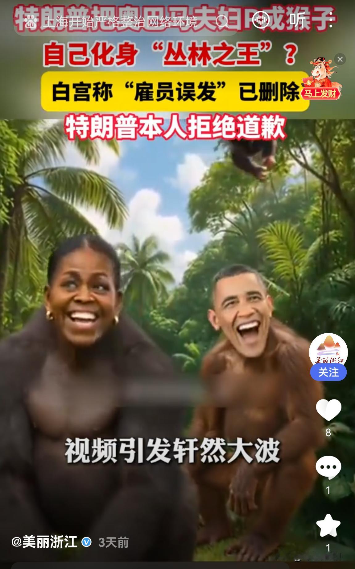美国|现总统特朗普把前总统奥巴马恶搞成猿猴!奥巴马回应,美国政治话语廉耻心、教养荡然无存! 这说明,美国政治文明彻底滑坡,底线失守!