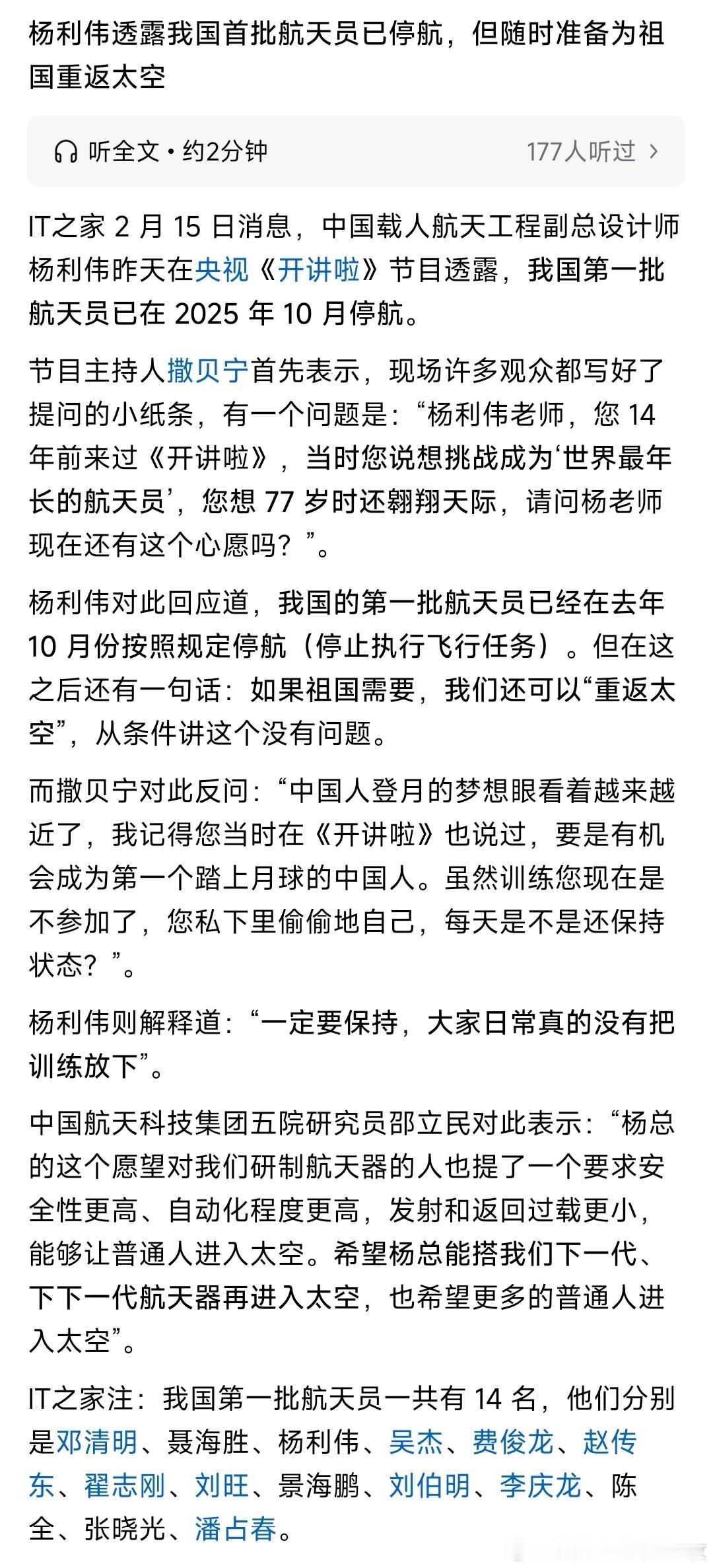 杨利伟透露我国首批航天员已停航。