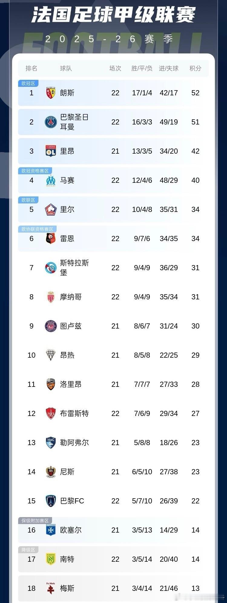 黑马!5-0 大胜巴黎FC,朗斯反超巴黎圣日耳曼暂登顶法甲积分榜