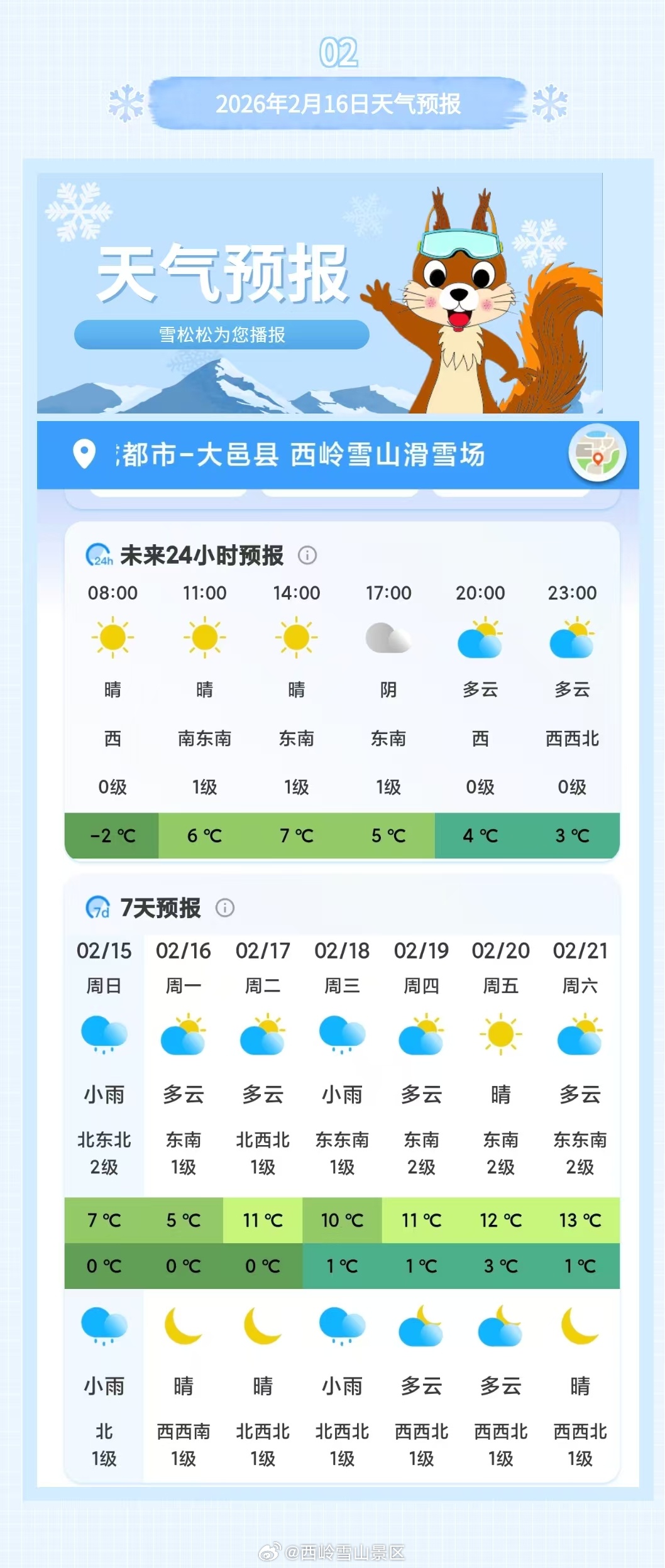 西岭雪山景区2月16日(周一)气象预报#西岭雪山##西岭雪山天气#