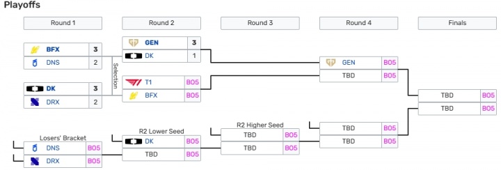 由于常规赛战绩中DK的3胜2负战绩不如另一组对决的T1和BFX,因此DK跌入败者组第二轮,后续交手DNS与DRX胜者,而T1将在败者组第三轮等到第两轮的胜者。