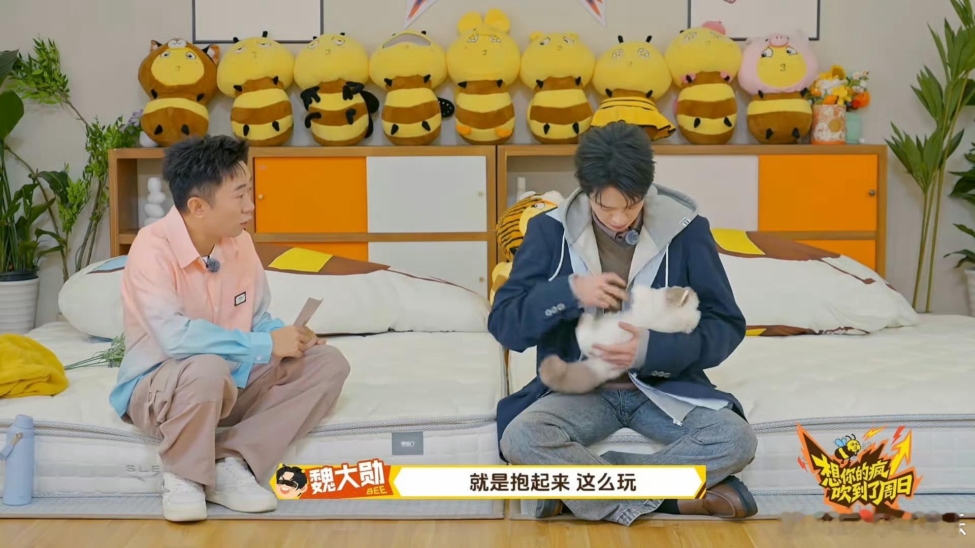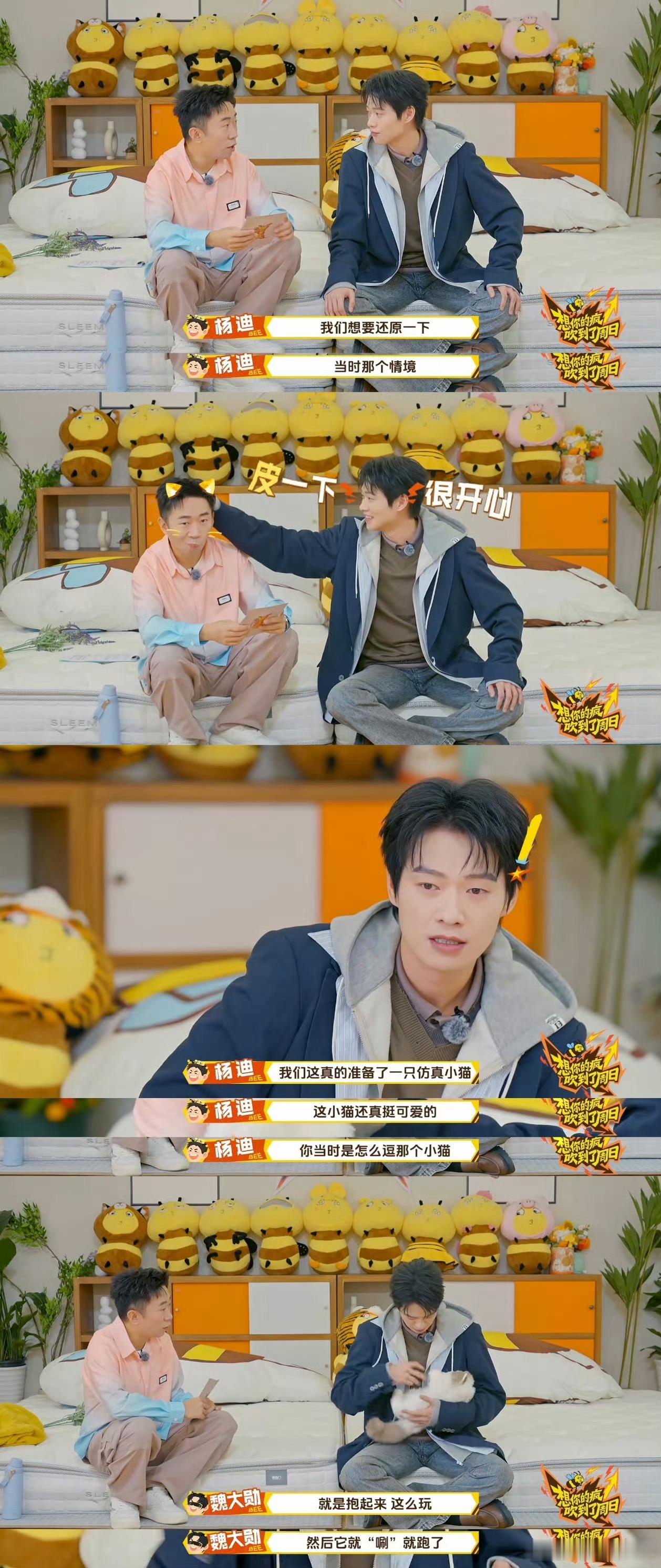 魏大勋还原摸猫神图名场面周五晚高疯 经典名场面梦幻复刻!魏大勋西装逗猫的温柔神图,在节目里完美还原,动作神态一模一样,温柔又帅气~