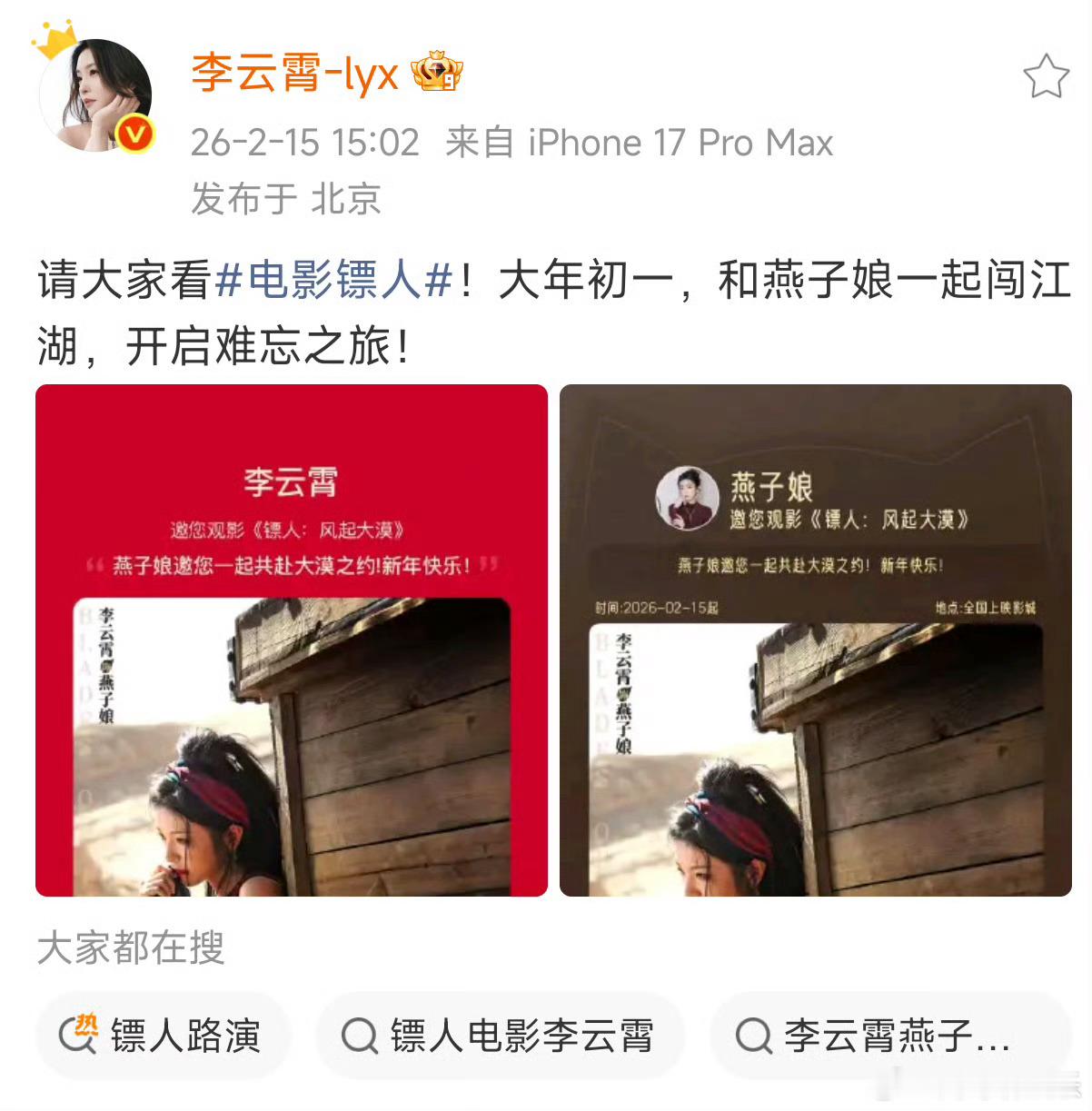 李云霄包场电影镖人 被李云霄的燕子娘狠狠拿捏!媚骨藏锋,柔中带刚,每一帧都自带江湖气。大年初一《镖人》上映,和李云霄一起影院见!
