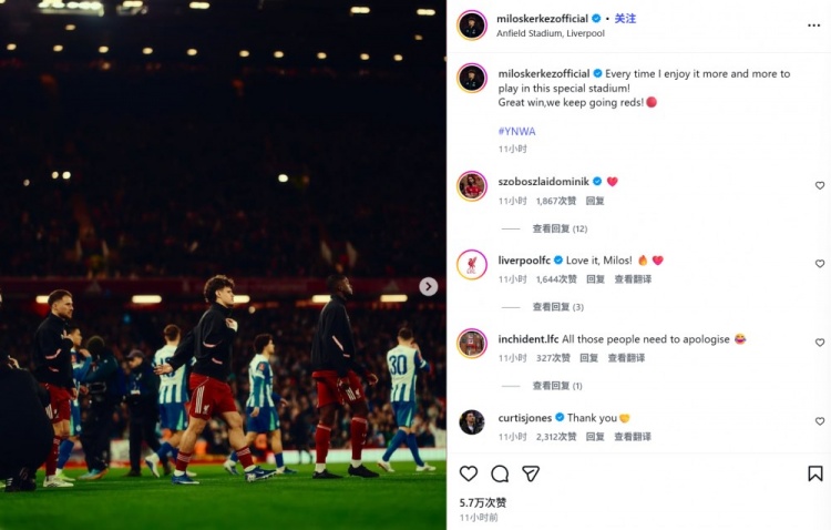 凯尔凯兹也在赛后通过社媒晒出自己的比赛照,并配文:“每次在这座特别的球场踢球,我都越来越享受!精彩的胜利,红军加油!”