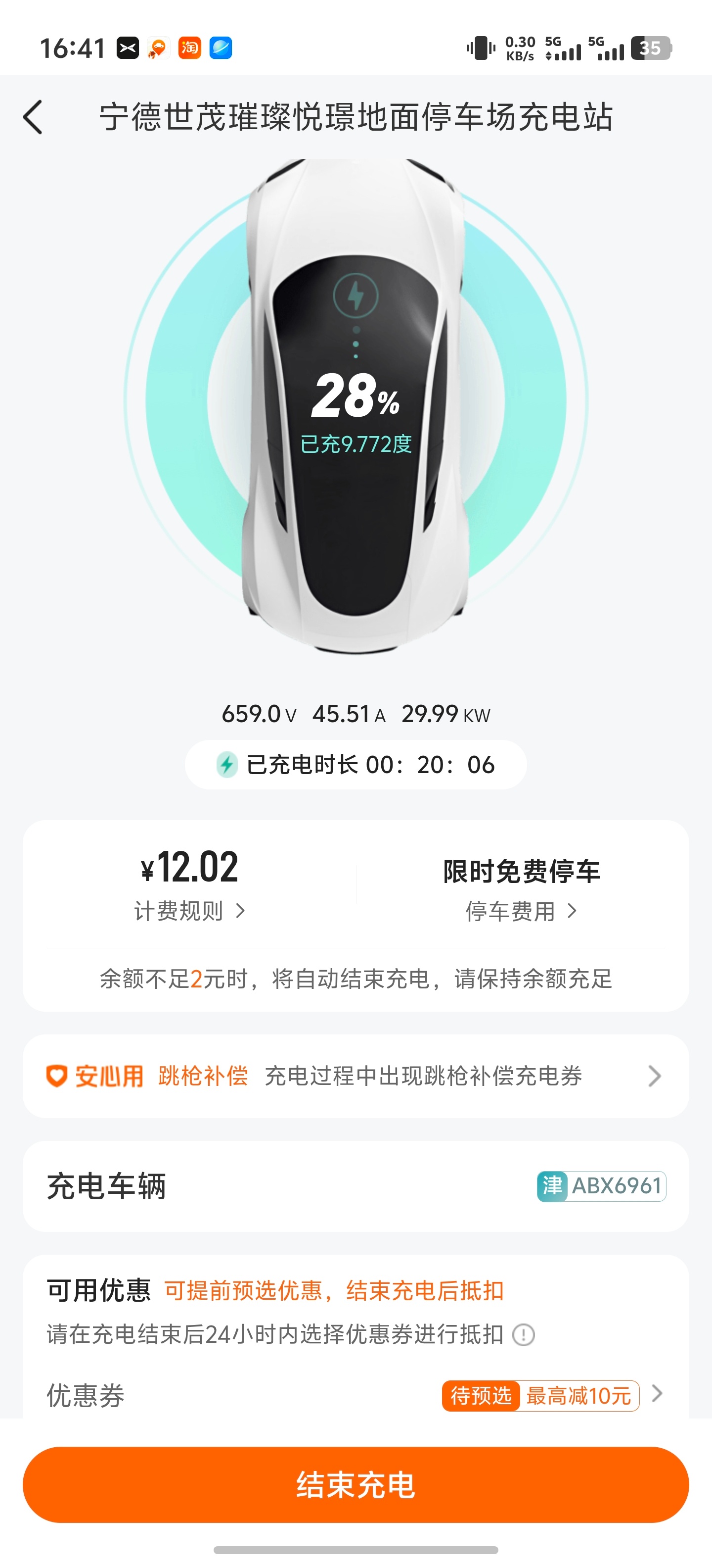 到了在宁德以后,正好那个小区有星星充电桩我就充电了,结果小区限制功率,最高就30kw,我为了用完那个满12-10元的优惠券,足足等了20分钟才花了12元,然后优惠券以后只需要支付了2元哈哈。赶紧拔枪走人,太慢了,不过他们住小区里的住户就无所谓慢不慢,插上充电枪可以回家,不用在车里等。