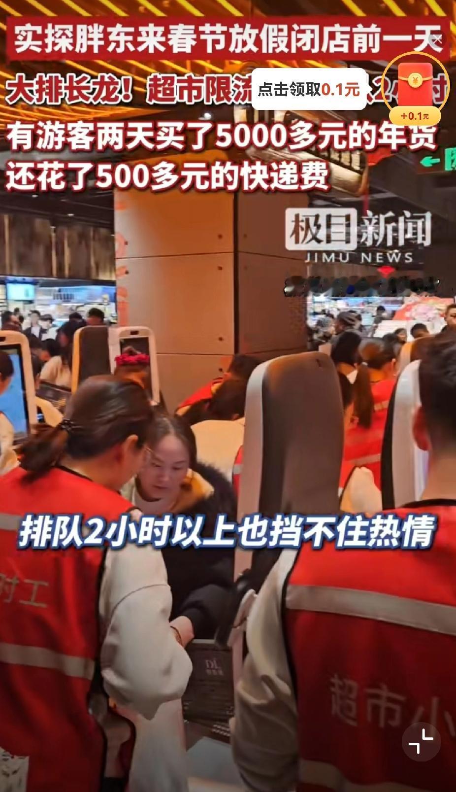 疯了!胖东来最后一天被挤爆,5000元年货花500寄走,游客:买到搬不动! 今天是胖东来春节前最后一天营业,现场直接挤到走不动道!全国各地的人都赶来扫货,手推车堆成小山,有人甚至买到提不动,直接在门口寄快递回家。 一位大哥更实在,买了5000多块年货,光快递费就花了近500块,不少网友笑他“太任性”,但懂的人都懂:这不是乱花钱,是真信得过胖东来的品质! 为了方便大家,胖东来早就在门店附近设好快递点,买完直接打包寄走,不用扛着大包小包赶车,服务贴心到骨子里。 人家不仅东西实在、价格透明,还处处替顾客着想,也难怪大家宁愿跨省、多花运费也要来买。这哪是逛超市,这是买个放心、买个舒心! 马上胖东来就要放假5天,没赶上的只能等年后啦。 你为了买年货最多花过多少运费?你去过胖东来吗? 男子在胖东来买5000元年货花500寄出 胖东来放假前最后一天